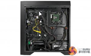 Moving to the cable management area on the right side we have a lot of room to manoeuvre. Cable routing is simple as there are multiple routing holes for getting the cable through to the components. There is also space for an additional 2.5 hard drive right below the CPU cut-out.