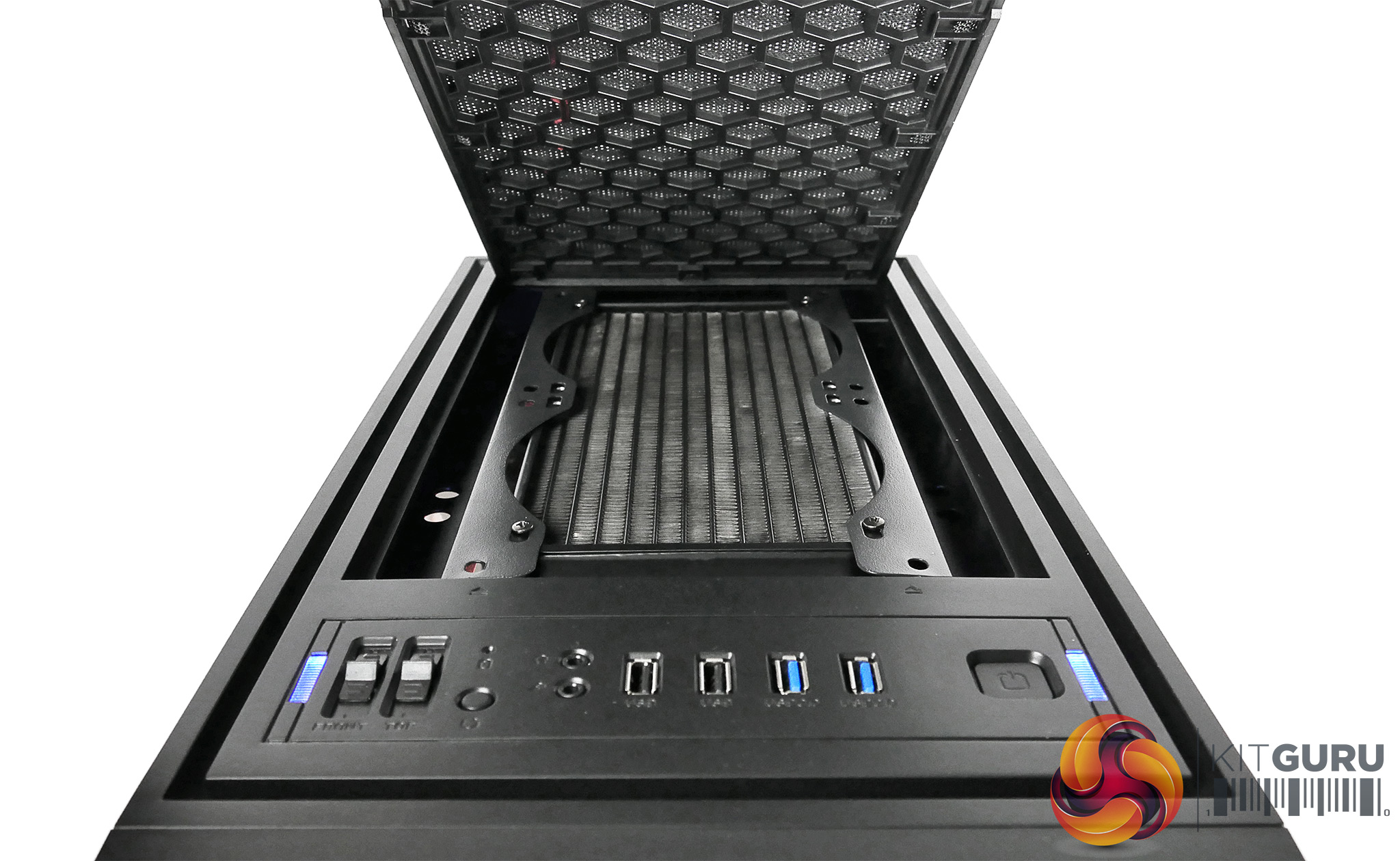 Installing the radiators and fans is made simple by the fact the two metal meshes located at the top and bottom are removable by just pressing down on them – this is much more convenient than removing the entire top panel.