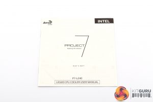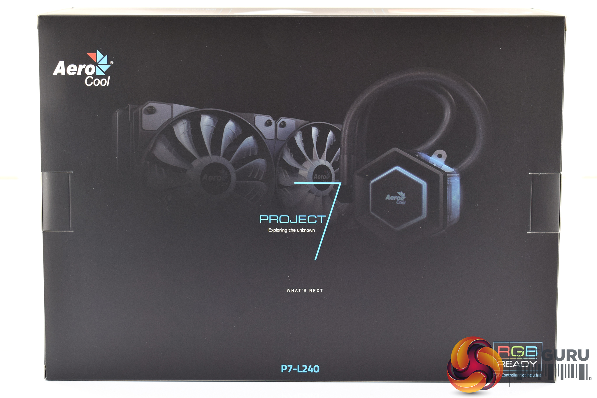 The Aerocool P7-L240 ships in a dark, almost mysterious box. A photo of the liquid cooler itself is visible on the front, but its bottom half fades to black, giving it an air of intrigue.