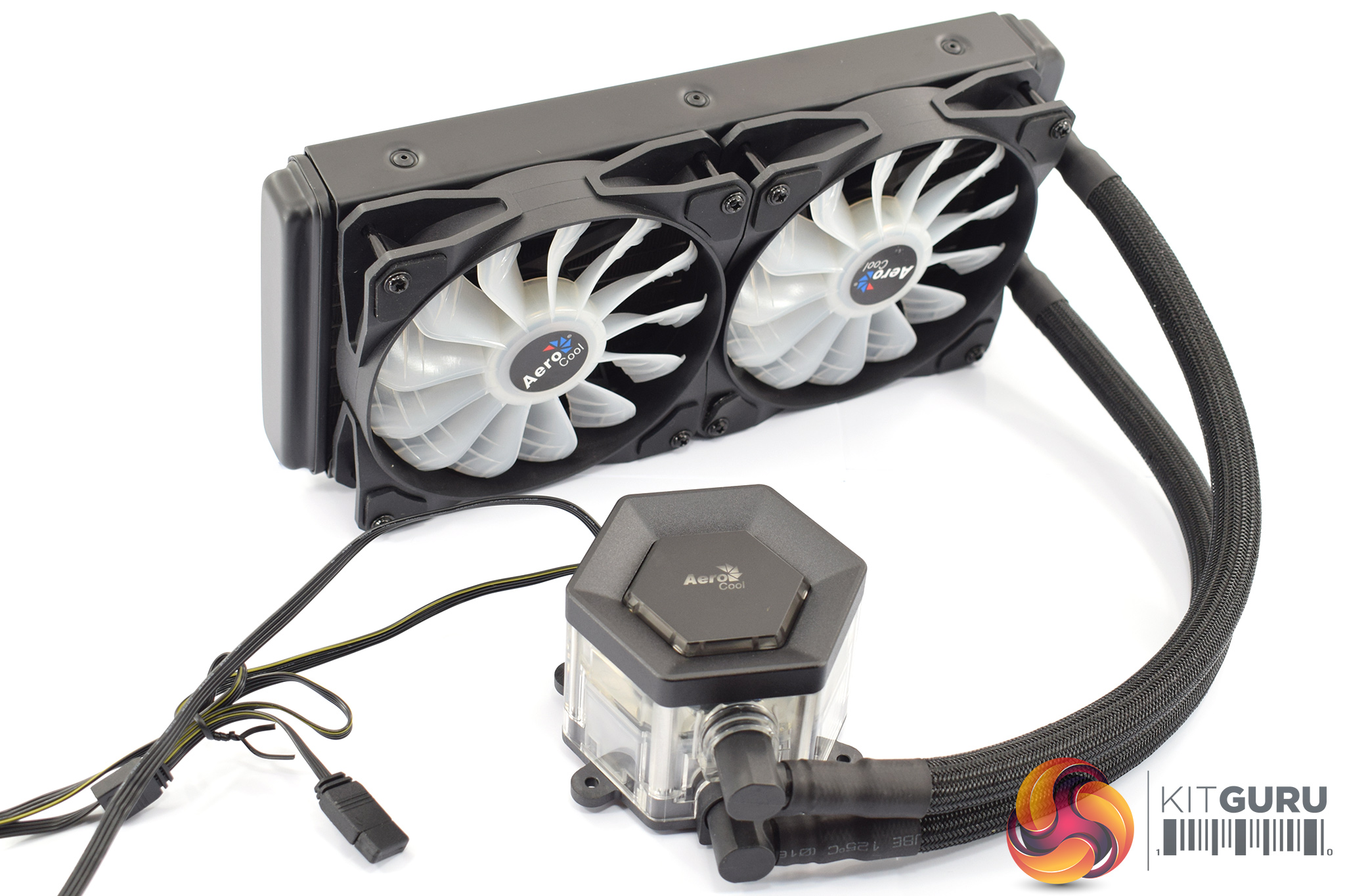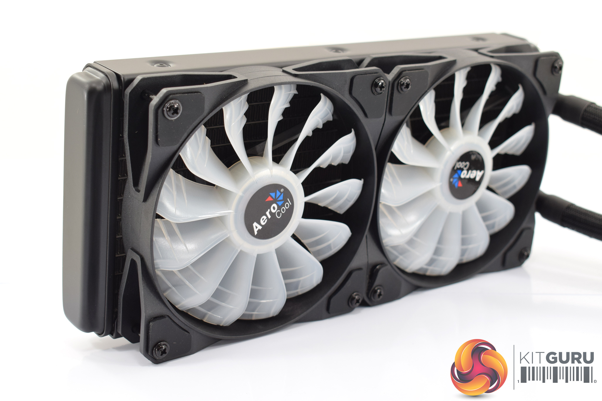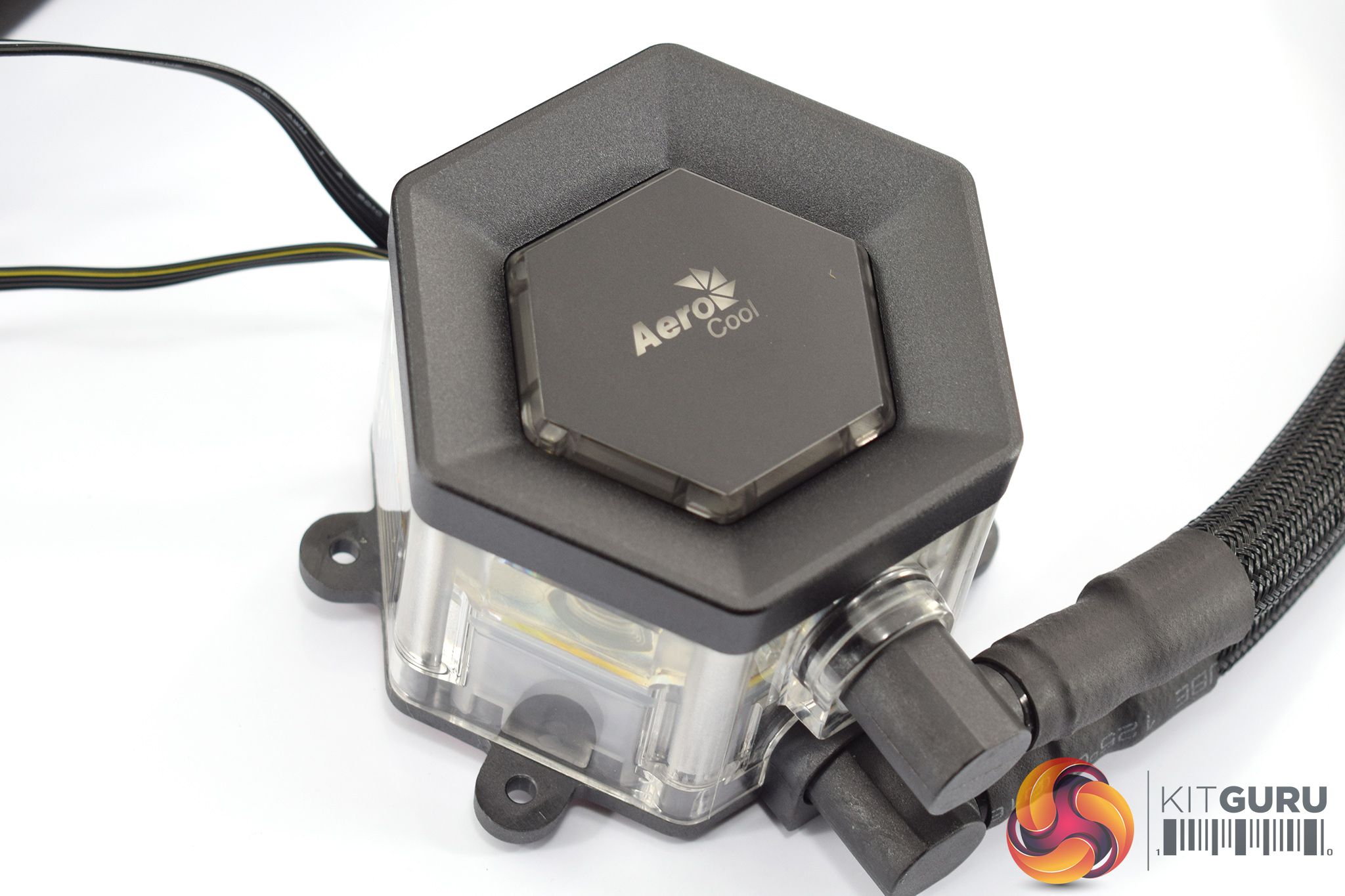 The pump/waterblock is quite a chunky unit, though that has been done deliberately to allow you to see the liquid moving, while the block also houses some RGB LEDs. Another reason for the block's thickness is that Aerocool has actually designed the cooler in a way which lets users top the liquid up as necessary.