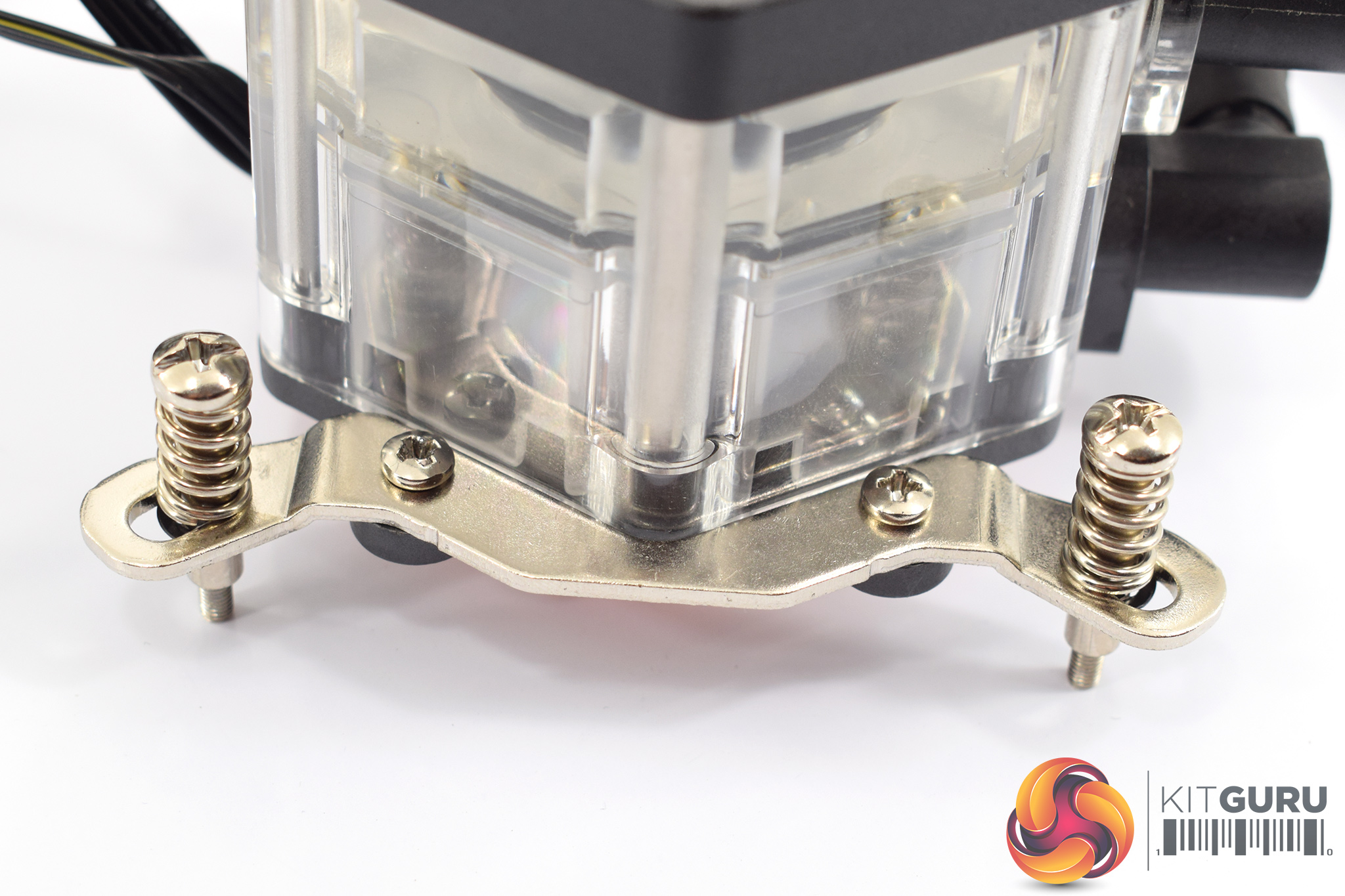 After that, two mounting brackets need to be screwed onto the pump/waterblock. Here, the manual actually says to screw them on from the underside but that obviously wouldn't work as the screw head wouldn't hold the bracket in place – something I tested myself. As pictured, I screwed the brackets on from the topside.