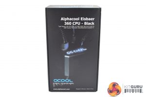 The Alphacool Eisbaer 360 ships in a large black box, while there is a photo of the Eisbaer's pump visible from the front.