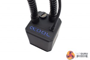 The large pump/CPU block unit sports the Alphacool logo in blue, as well as a fill port – useful if you are adding another component to the loop and need to top-up the coolant levels.
