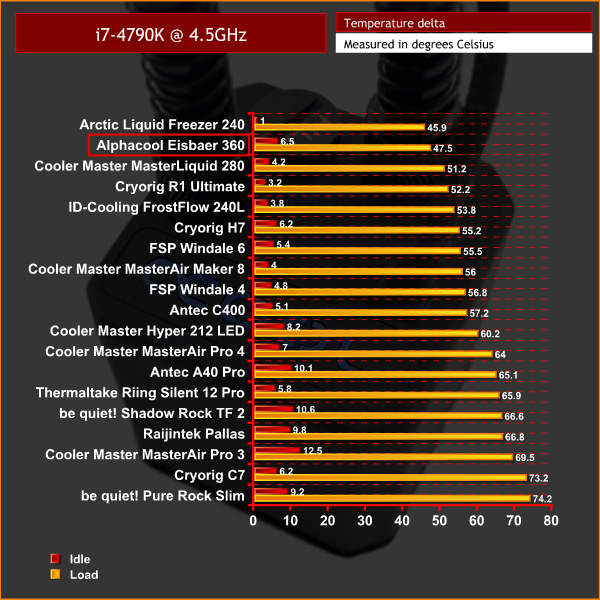 As you can see – and as we expected – the Eisbaer 360's performance is very good. It tops the stock-clocks chart while its performance is only just behind the Liquid Freezer 240 when we overclocked the CPU. For those curious how the 240mm Liquid Freezer outperformed this 360mm unit, it would be because the Liquid Freezer has a thicker radiator and it also ships with four fans to use in push-pull, something the Eisbaer does not do.