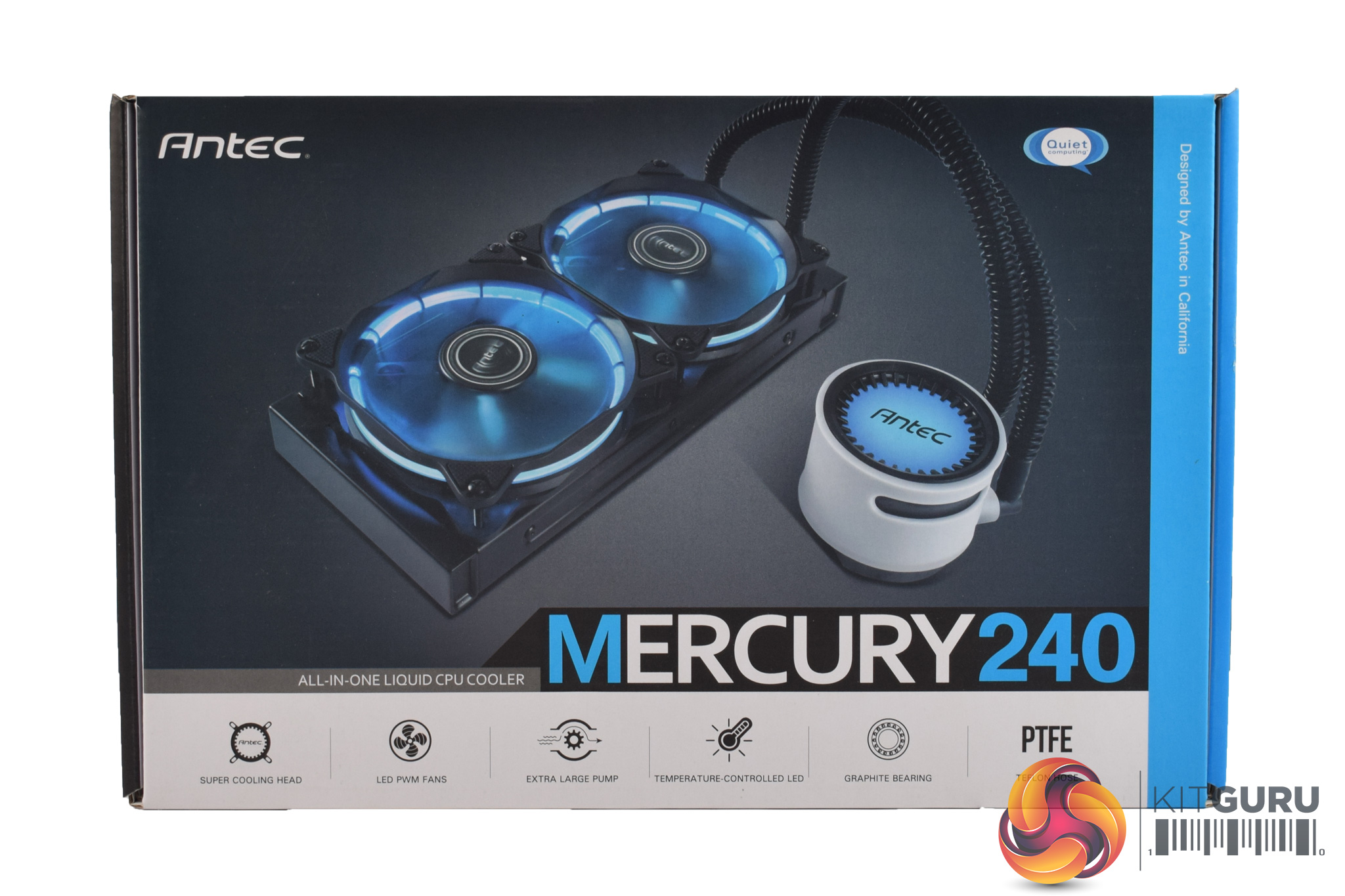 The Antec Mercury 240 ships in a dark box with blue and white accents, along with a photo of the cooler on the front.