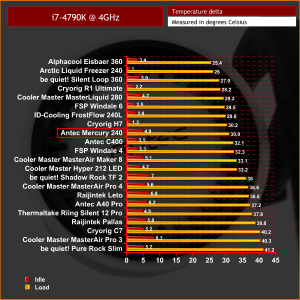 As you can see, across both tests, the Mercury 240's performance is a bit disappointing. I re-mounted and re-ran my tests to confirm the accuracy of the figures and I got the same results. The Cryorig H7 – a £35 air cooler – actually out-performs the £80 Mercury 240 in both tests.