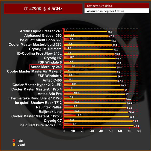 We have since received a new sample from Antec, as they thought we had been sent a pre-production sample that was not indicative of the cooler's true performance. Having tested this new Mercury 240, there is some merit to what Antec said – the CPU came in around 1.5C cooler when overclocked, and 0.5C cooler when running at stock. This is not a huge difference, but it is certainly better than before.