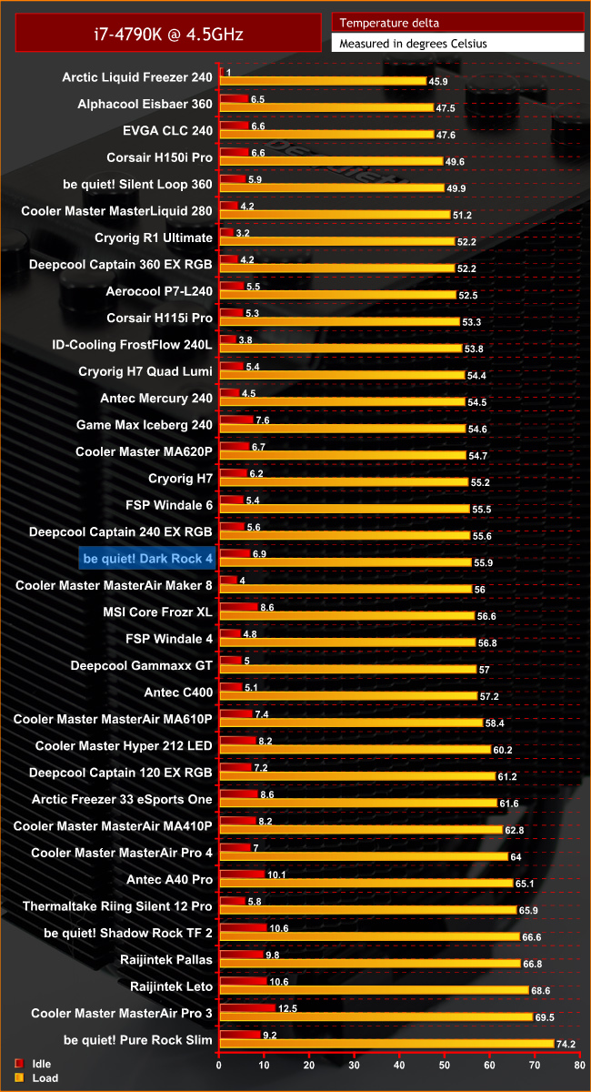 Getting right to it, you'd be forgiven for thinking the Dark Rock 4 is a rather average cooler – it does, after all, land right in the middle of our performance charts. However, most of the top entries on both charts are actually liquid coolers, and that means the Dark Rock 4 is one of the better-performing air coolers to come through our labs.