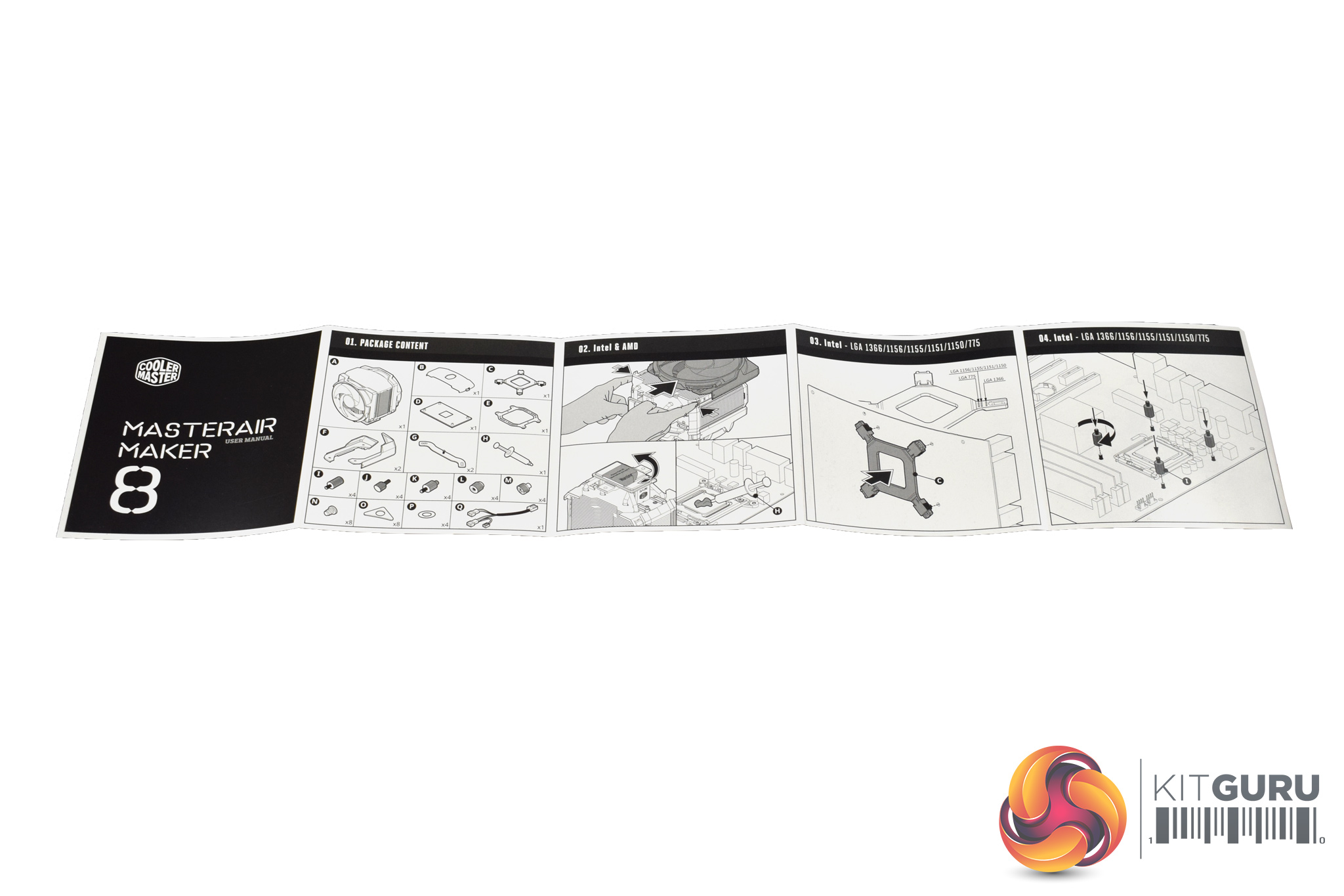 The Cooler Master MasterAir Maker 8 ships in a black box, while a top-down photo of the cooler itself is visible from the front.
