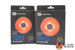 The Cooler Master MasterFan Pro RGB fans come in dark grey boxes with a large product photo visible on the front. For this review we were sent 1x 120mm Air Flow model, and 1x 140mm Air Flow model.