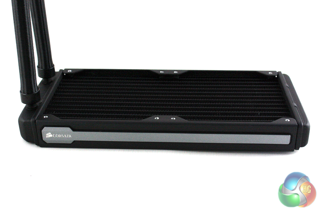 The 240mm radiator is very similar to those we have seen in the past from Corsair. The only slight difference is the addition of a piece of grey trim which boasts the Corsair logo. This improves the radiator from an aesthetic point of view, and we understand that these are interchangeable and can be customised with different colours. Unfortunately Corsair do not include any other coloured trim with the unit.