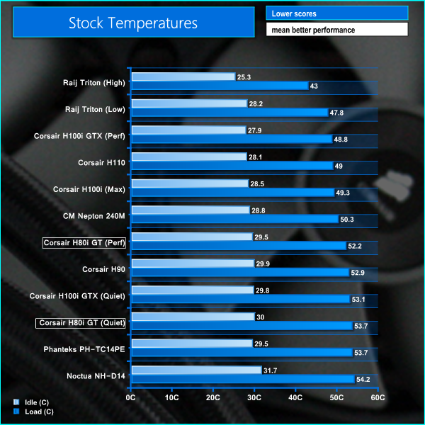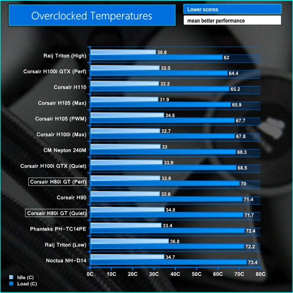 We can see that the thermal performance of the H80i GT is fairy good, although it lags behind the H100i GTX by a fair margin. The configuration options available in the Corsair Link software will allow you to set up the cooler to achieve the ideal balance between cooling performance and acoustics.