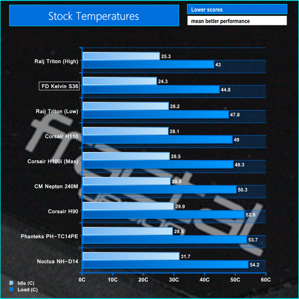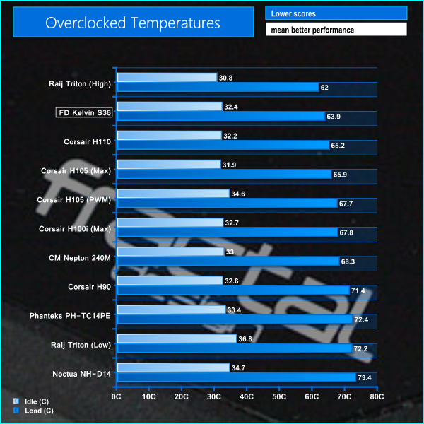 It is quite clear from the graphs above that the Kelvin S36 offers absolutely excellent performance. It is only outperformed by the Raijintek Triton with its fans at full speed, although noise levels are close to unbearable. In contrast, the Kelvin S36 is very quiet in operation and would be easy to live with on a daily basis.