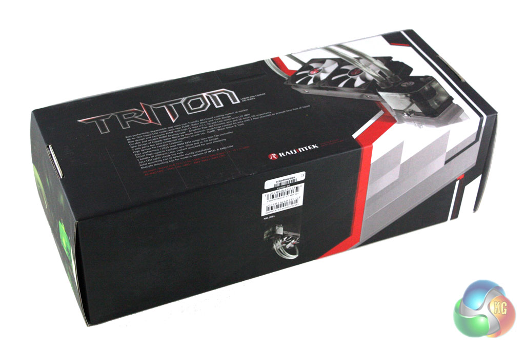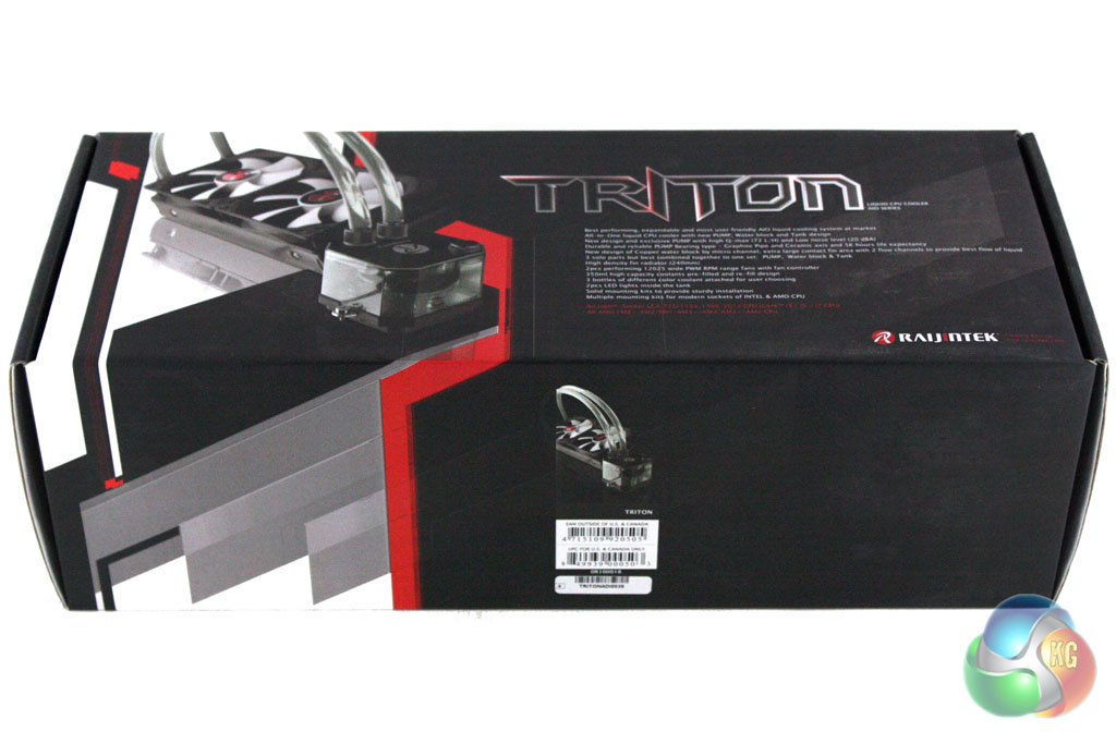 The Raijintek Triton AIO is supplied in a substantial box which reflects the large size of the cooler within. It is decorated in a black, red and white livery with an image of the cooler on the front.