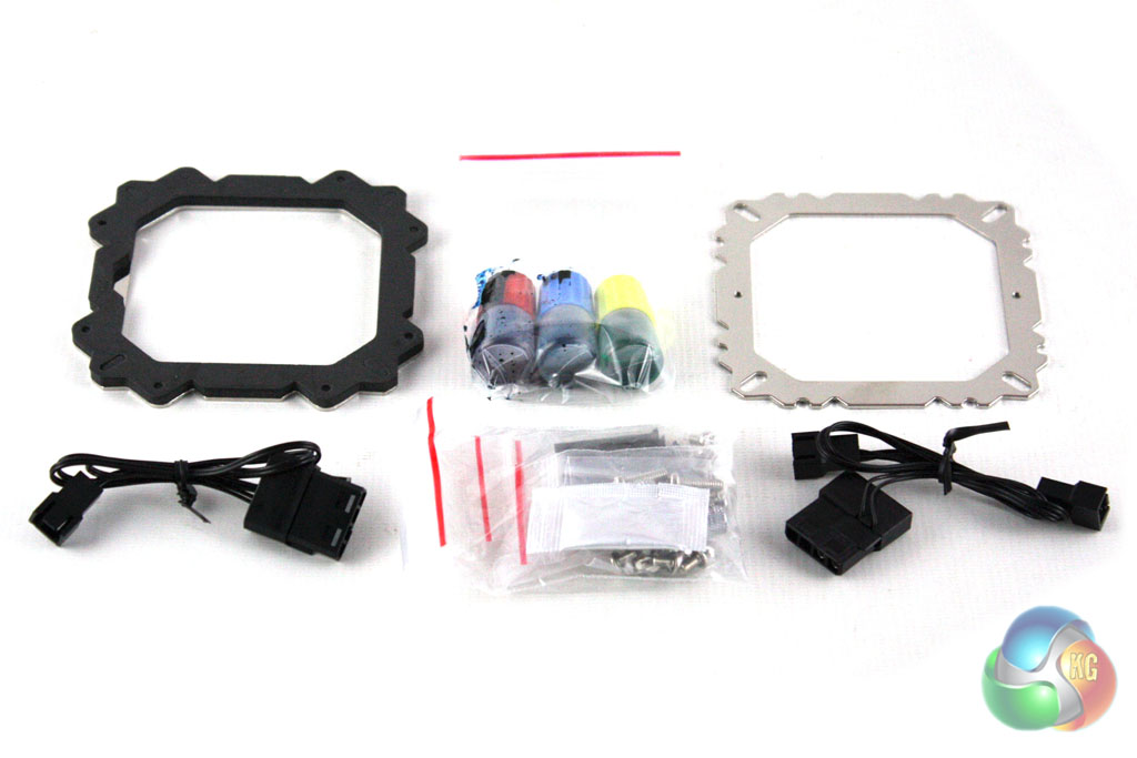 Inside the box we find all of the accessories required to install the cooler onto most current platforms. Raijintek also include two 120mm fans with the cooler and a series of three coloured dyes for the watercooling loop.