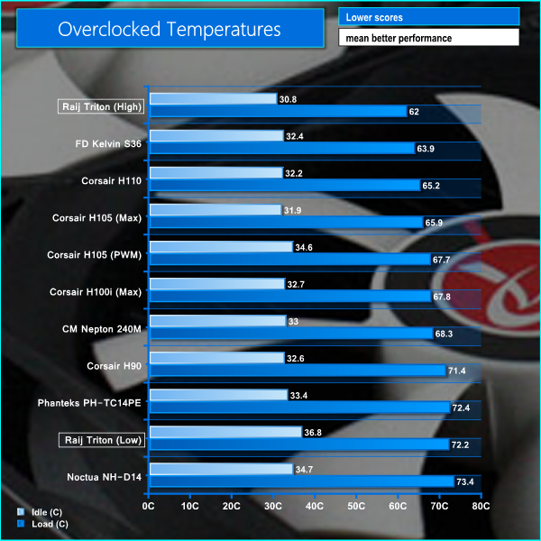 These temperatures are very impressive, showcasing the capability of this cooler. It is quite clear that it struggles a little with low airflow when overclocked as the temperatures were significantly affected in the low fan speed test.