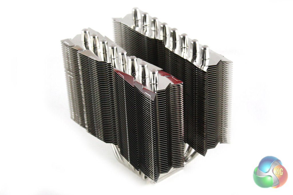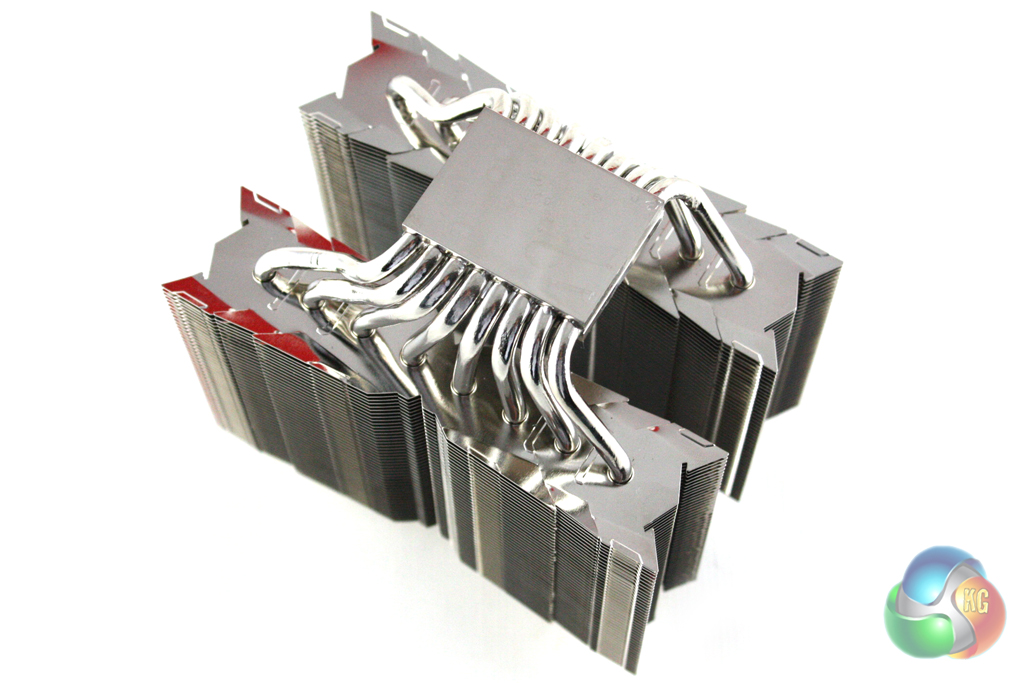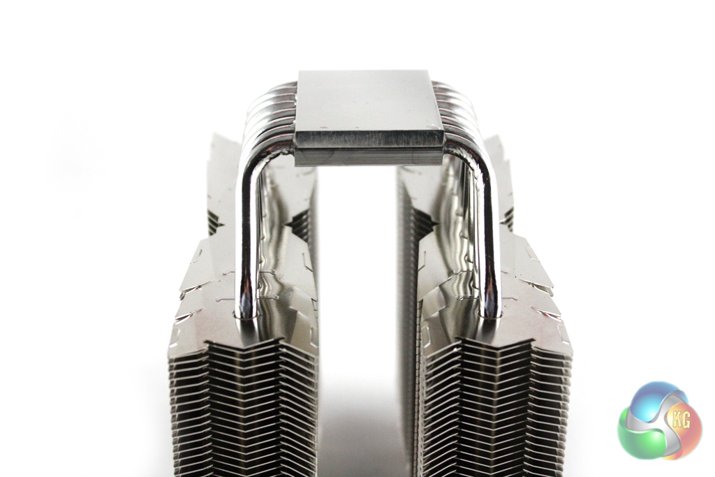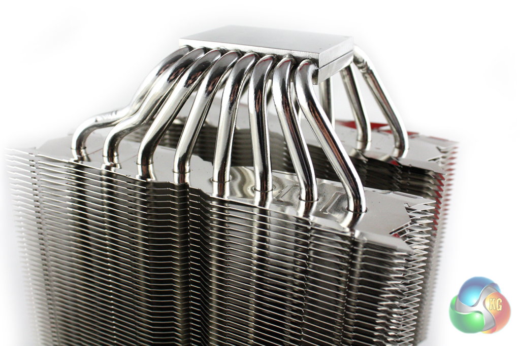 The eight 6mm heatpipes are also made from nickel-plated copper and pass through the CPU block at the bottom and curve up to pass through the two stacks of fins on either side.