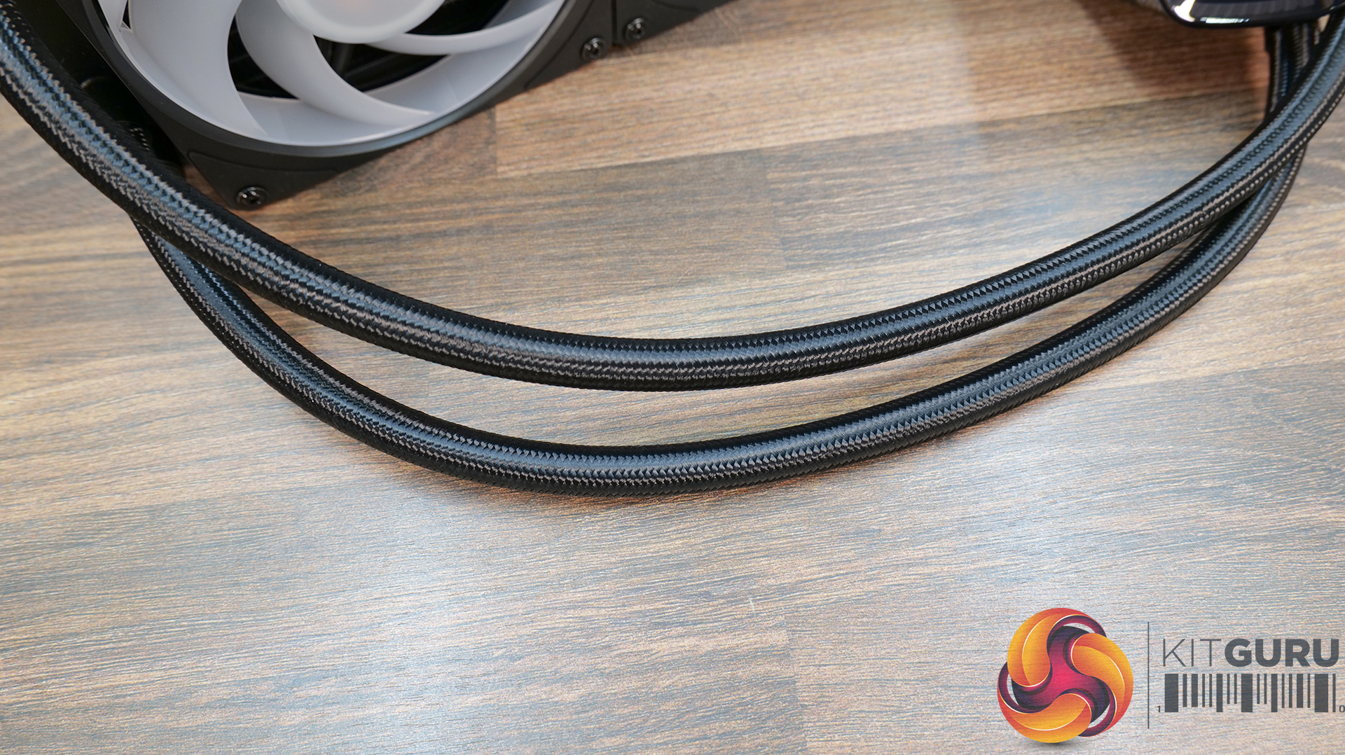 The 360 ION radiator is designed in-house by Cooler Master, it's an aluminium radiator with dimensions of 394 x 119.6 x 27.2 mm. The black coating has a mild textured feel, at the radiator side the tubing is fixed in position and there is a premium braided sleeving covering the tubing.