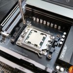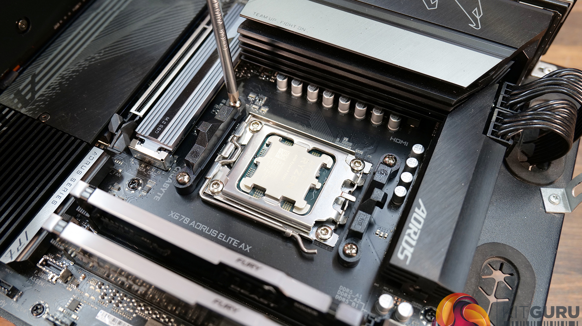 Now the CPU block can be lowered into position over the CPU, aligning the mounting holes in the bracket with the standoffs. Initially tighten the thumbscrews up by hand working evenly and progressively for best contact, then finish off tightening using a screwdriver.