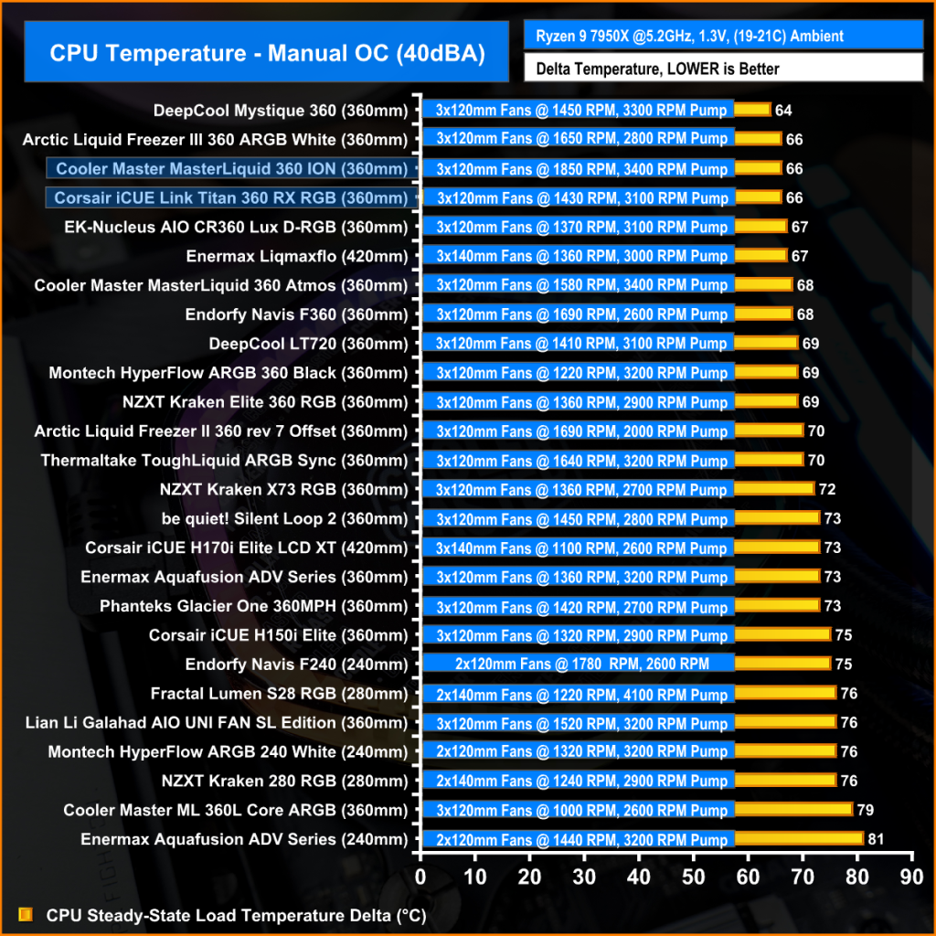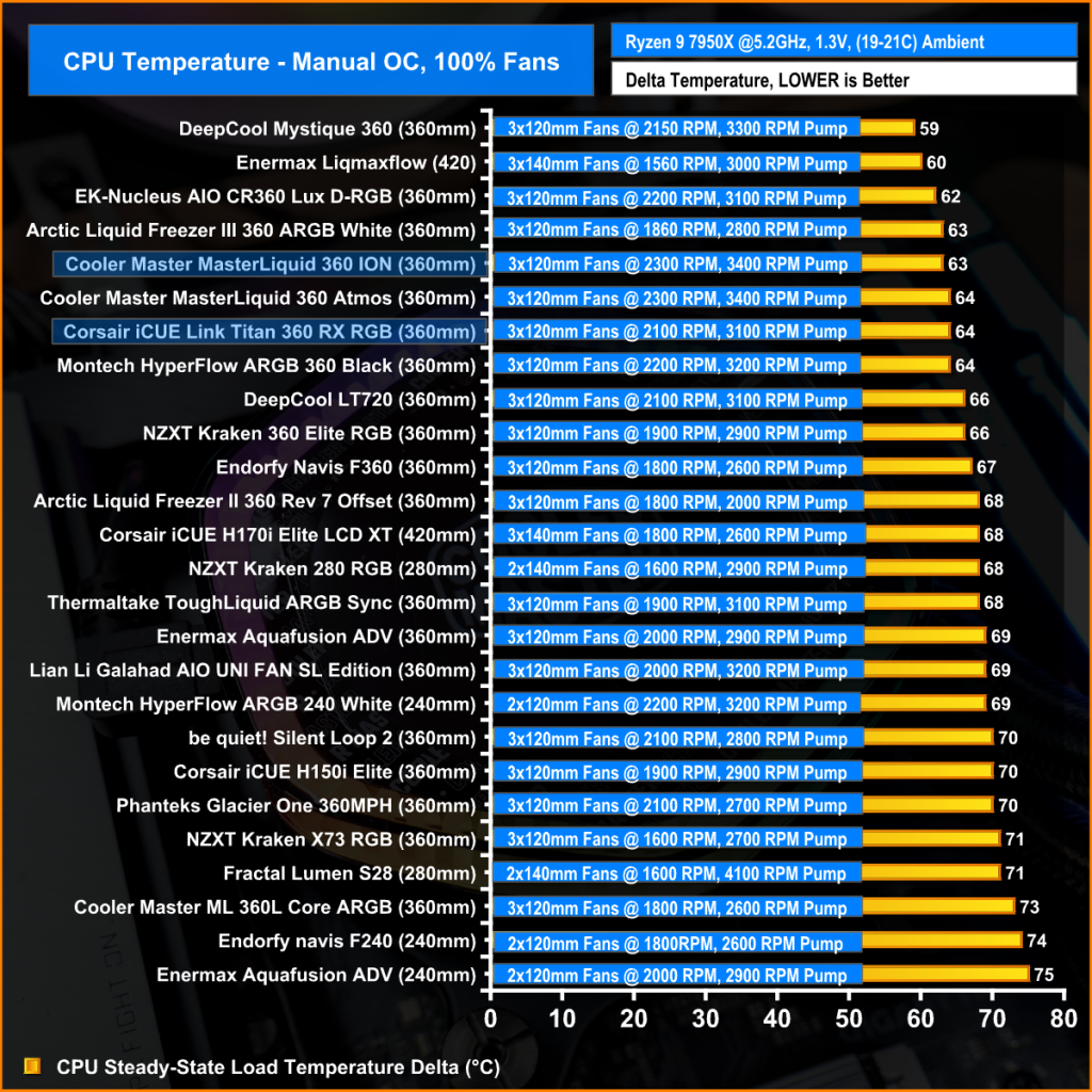 With fan speed maxed out and the CPU frequency/voltage locked both the Cooler Master MasterLiquid 360 ION and the Corsair iCUE Link Titan 360 RX RGB show great thermal performance, trading blows with the top coolers.