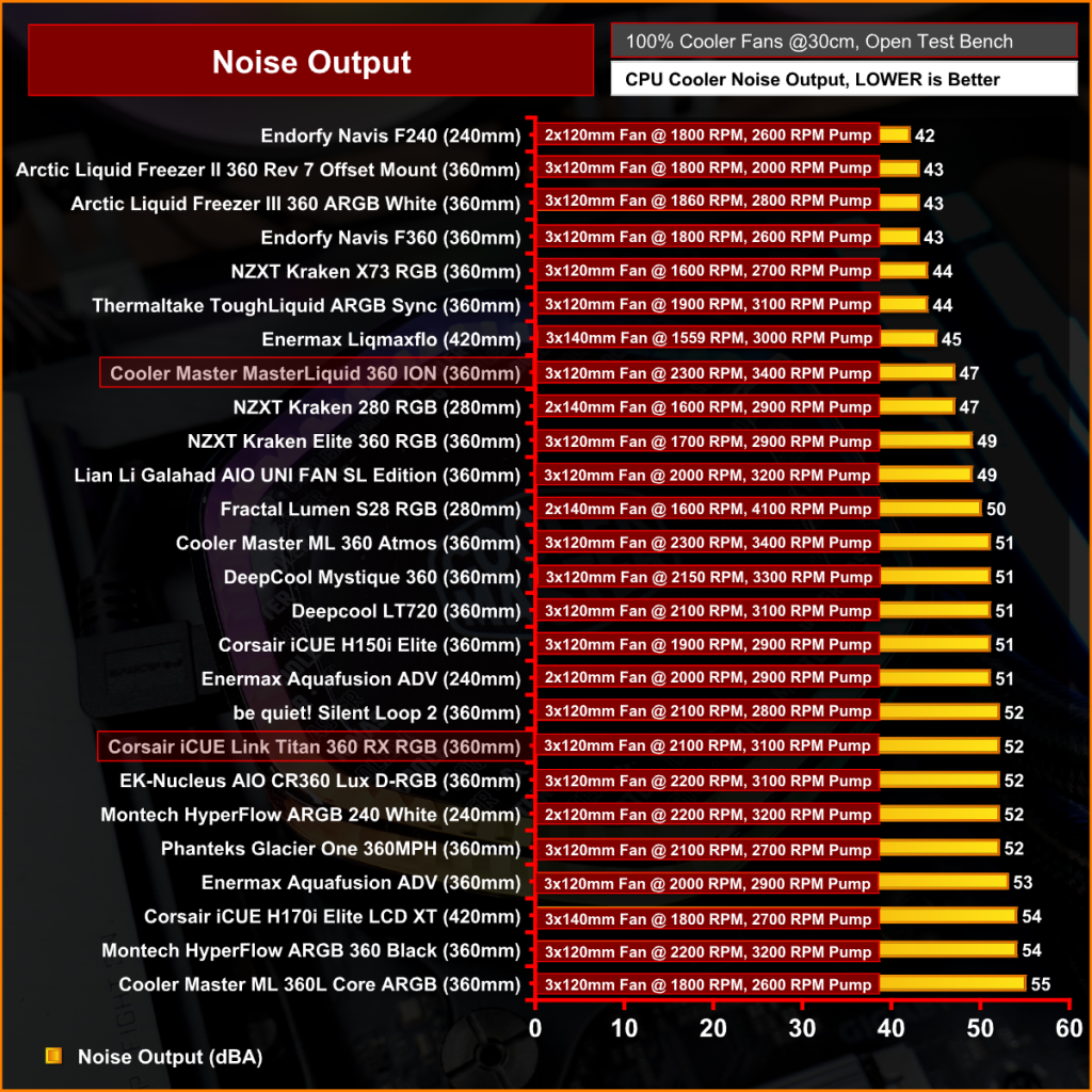 In terms of the noise output the Cooler Master MasterLiquid 360 ION does well here, especially considering the 2300RPM fan speed which is high compared to others with similar noise levels. The Corsair Titan RX is quite loud with fans running at maximum speed.