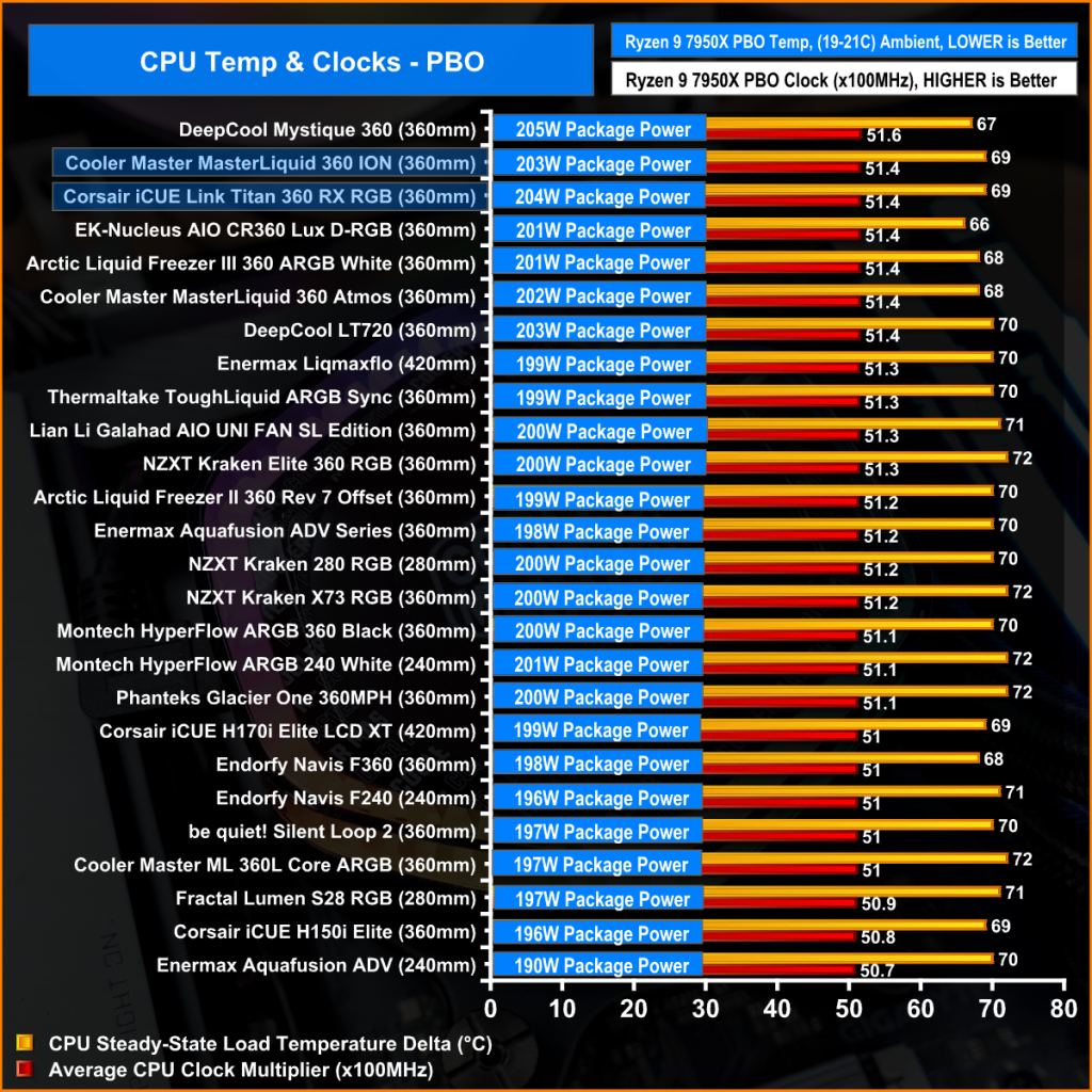 In the PBO test we see excellent thermal performance and clock multiplier from the Corsair iCUE Link Titan RX and the Cooler Master MasterLiquid 360 ION. The higher clock multiplier will yield better CPU performance so these coolers are a great choice for running an AMD CPU with PBO enabled.