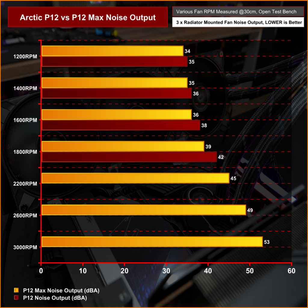 Even at the higher RPM range that the P12 can't reach, the P12 Max is still relatively quiet. At 3000RPM the P12 Max only outputs 53dBA which is quieter than some coolers/fans that we have previously tested which run much lower maximum RPM.