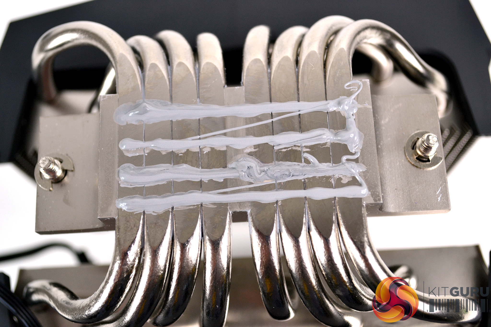 For the next part of the installation process, Arctic suggest applying the thermal compound. Arctic claims the best way to apply thermal compound into the base of the Freezer 50 TR is in a series of straight lines across the heat pipes, after removing the protective label of course.