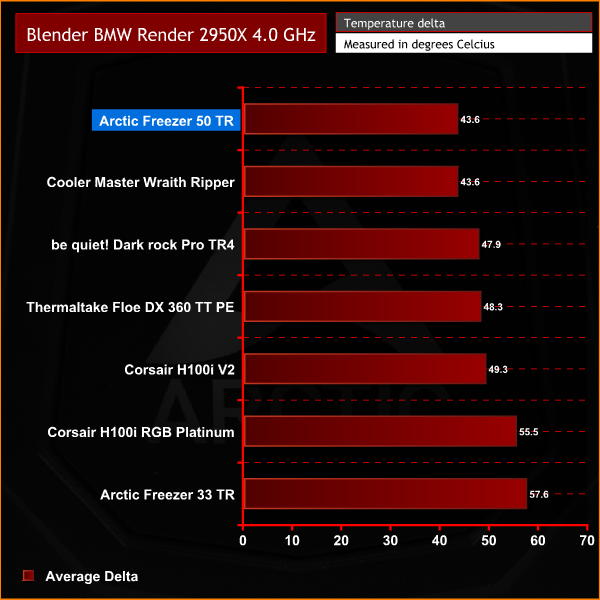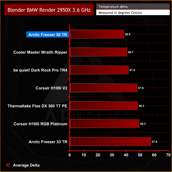 During our productivity testing using the Blender BMW render, the Arctic Freezer 50 TR comes out on top. In our overclocking test, it's neck and neck with the Cooler Master Wraith Ripper. However, at the lower 3.6 GHz all-core frequency, the Freezer 50 TR pulls out a slender lead.