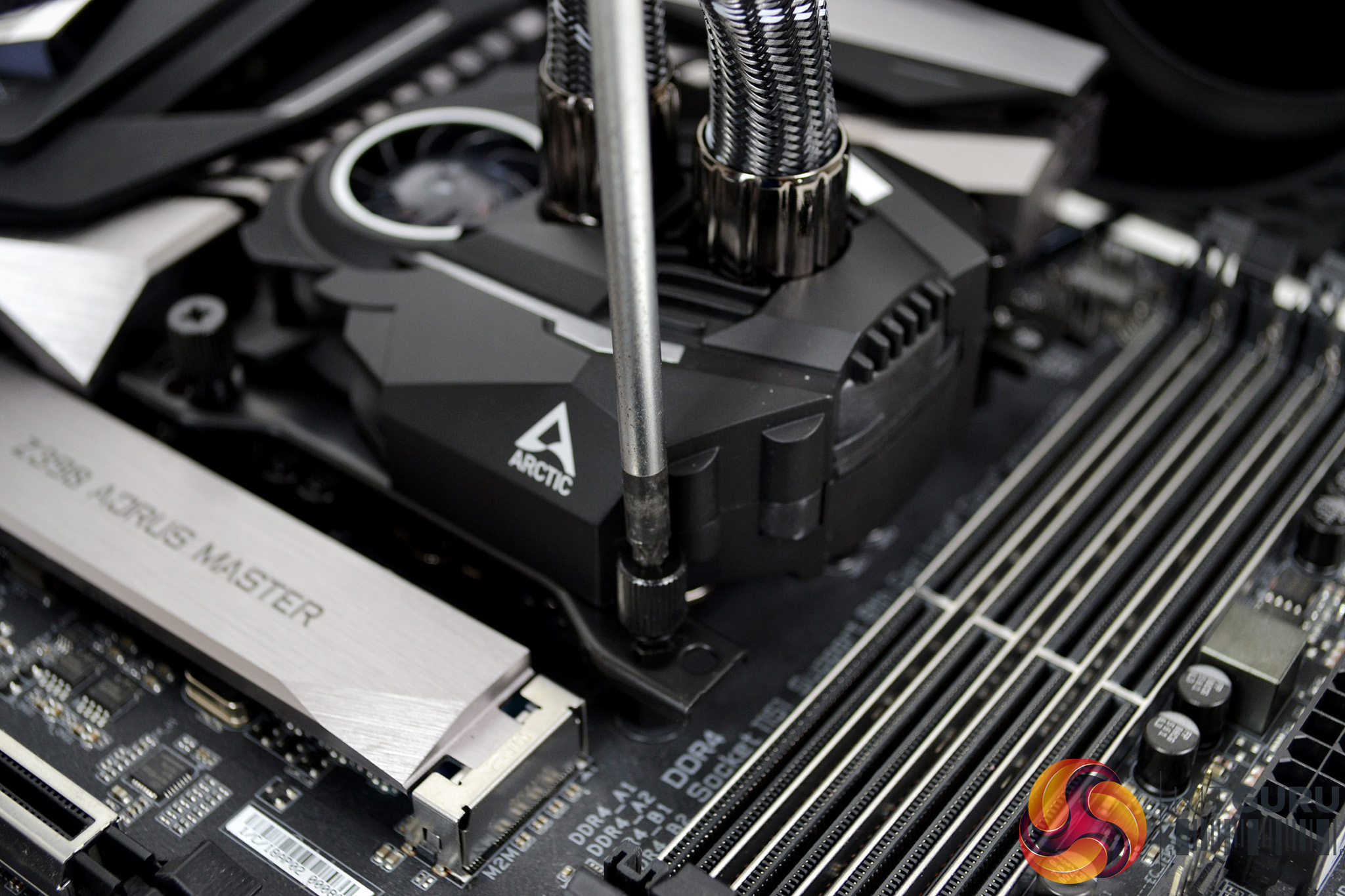 Next, apply the thermal compound to the CPU IHS in your preferred method and lower the pump down onto the CPU socket in the orientation best suited to your motherboard layout. Using the four thumbscrews, tighten the pump down in an X pattern to ensure an equal spread of pressure. Final tightening can be achieved with a Philips screwdriver.