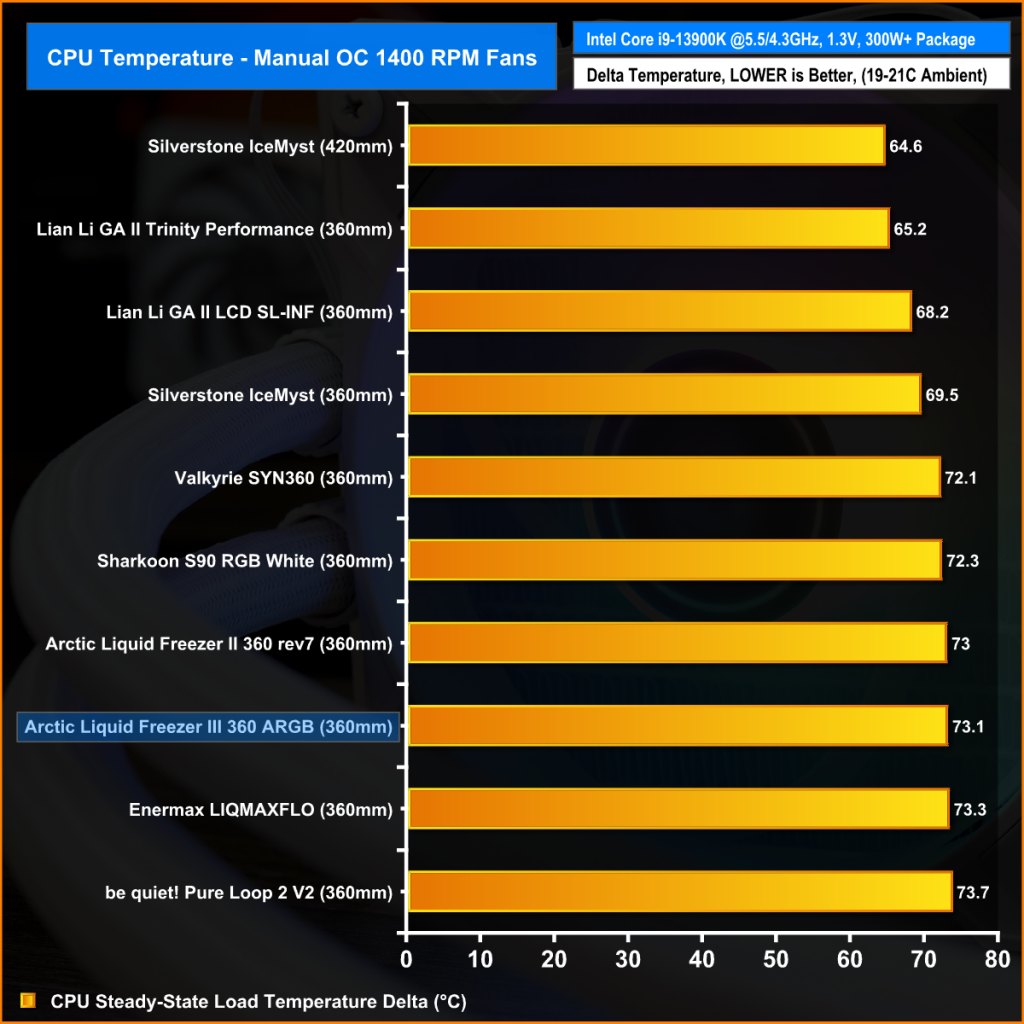 In our final test on the 13900K we fixed the fan speed to 1400 RPM on all coolers, but again the Liquid Freezer III performance isn’t as good as we hoped and there's no improvement in thermal performance versus the Liquid Freezer II 360. So either the Liquid Freezer III is more optimised for AMD CPUs or its simply overwhelmed by the 300W plus package power produced by the i9-13900K.