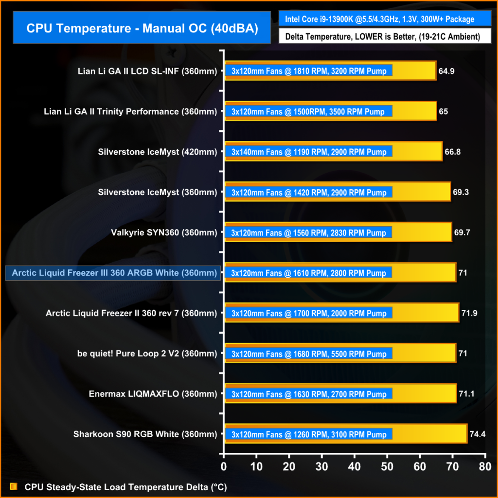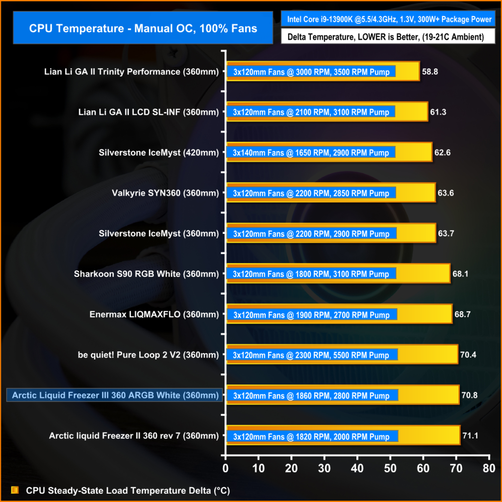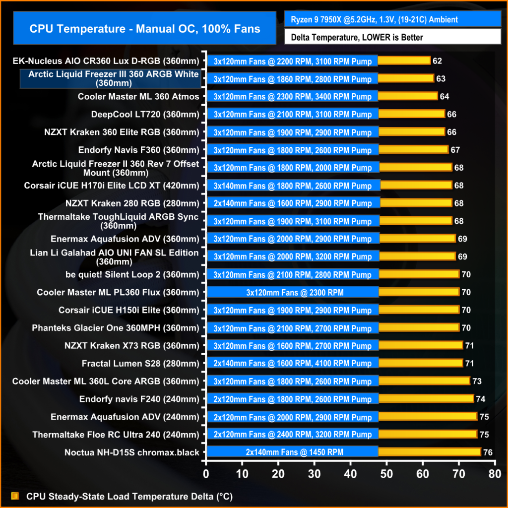The Liquid Freezer III 360 performance in this test is superb, producing an average CPU delta temperature of 63°C and almost topping the chart. Only the more expensive EK-Nucleus can outperform the Liquid Freezer III and it uses a much higher maximum fan speed and is significantly more expensive.