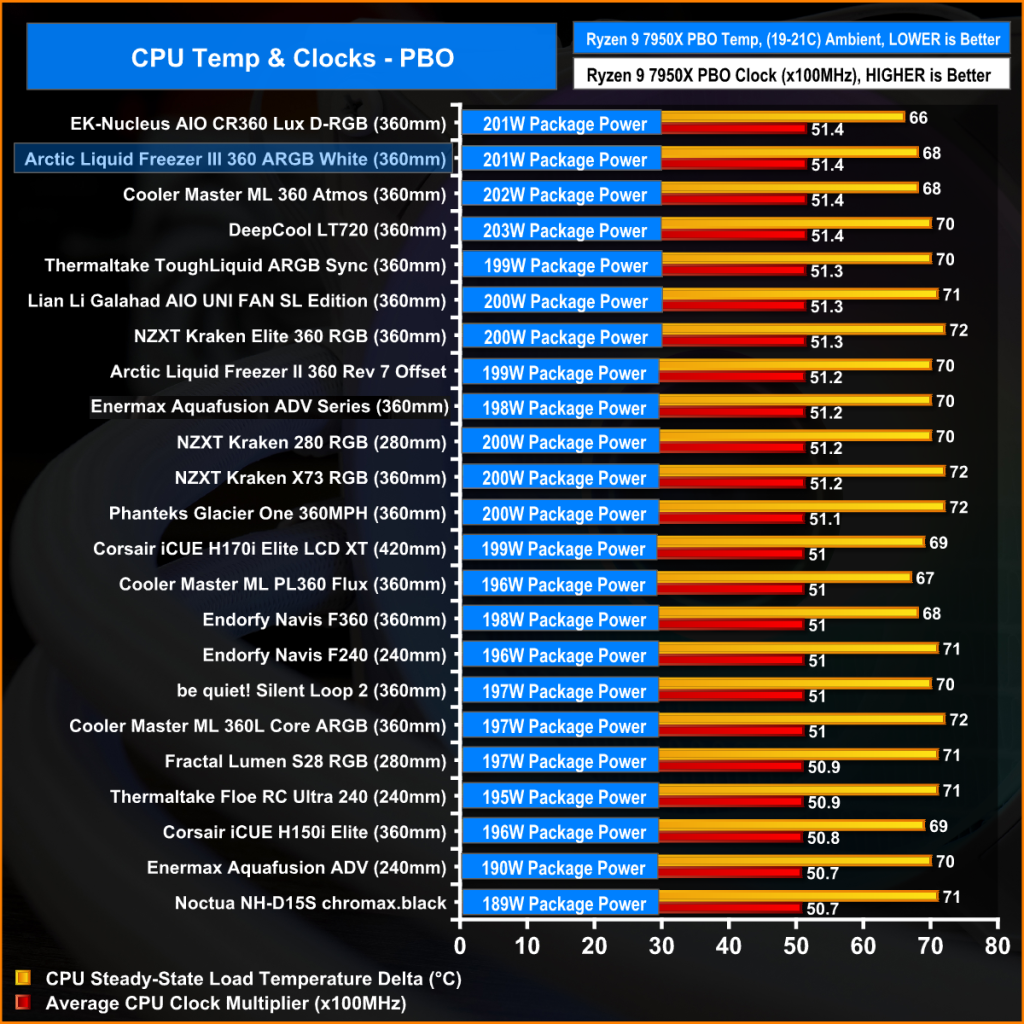 In the 7950X PBO test, again the Liquid Freezer III shows its solid performance by cooling 201W package power to an average delta of 68°C, while holding an average clock multiplier of 51.4X which is again right at the top of the charts and equalling the performance of more expensive 360mm AIO coolers. So performance in all scenarios on AMD Ryzen 9 7950X is great.