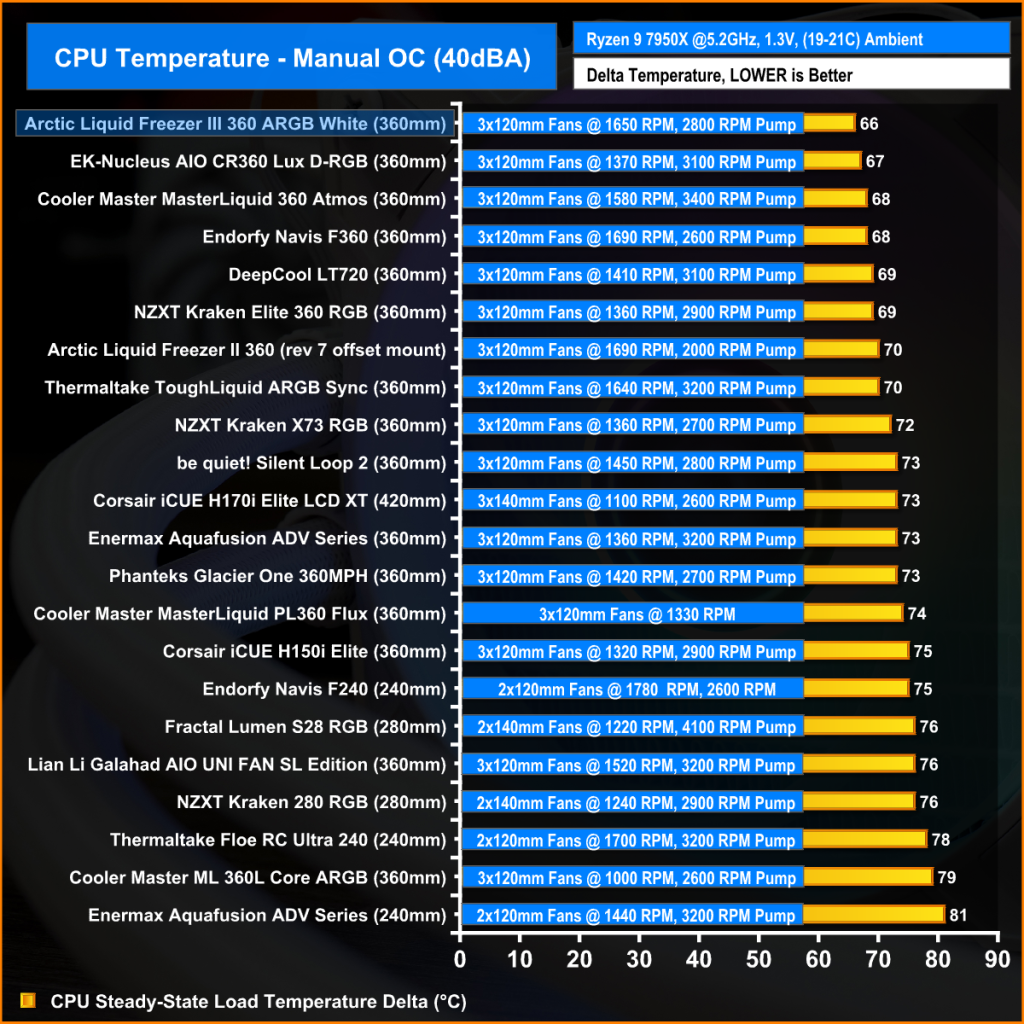 The noise output of the Liquid Freezer III at maximum fan speed is very quiet so it has an advantage over the competition when we reduce fan speed to normalise noise output. In the noise normalised test, the Liquid Freezer III again shows it has excellent performance on the AM5 platform, with an average CPU Delta of 66°C which means it tops the noise normalised chart.