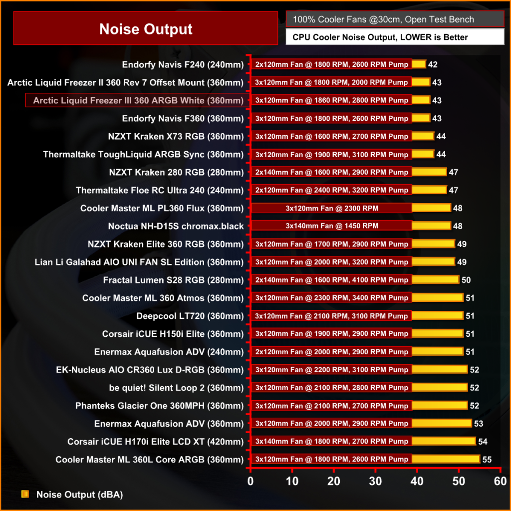 In terms of noise output the Liquid Freezer III is virtually identical at maximum fan speed as the Liquid Freezer II as it uses the same P Series fans. So the Liquid Freezer II is extremely quiet at maximum fan speed compared with most high-performance coolers, so if noise is important to you then this is a great choice. And it explains why there isn’t much of a drop in thermal performance when we normalise noise to 40dBA