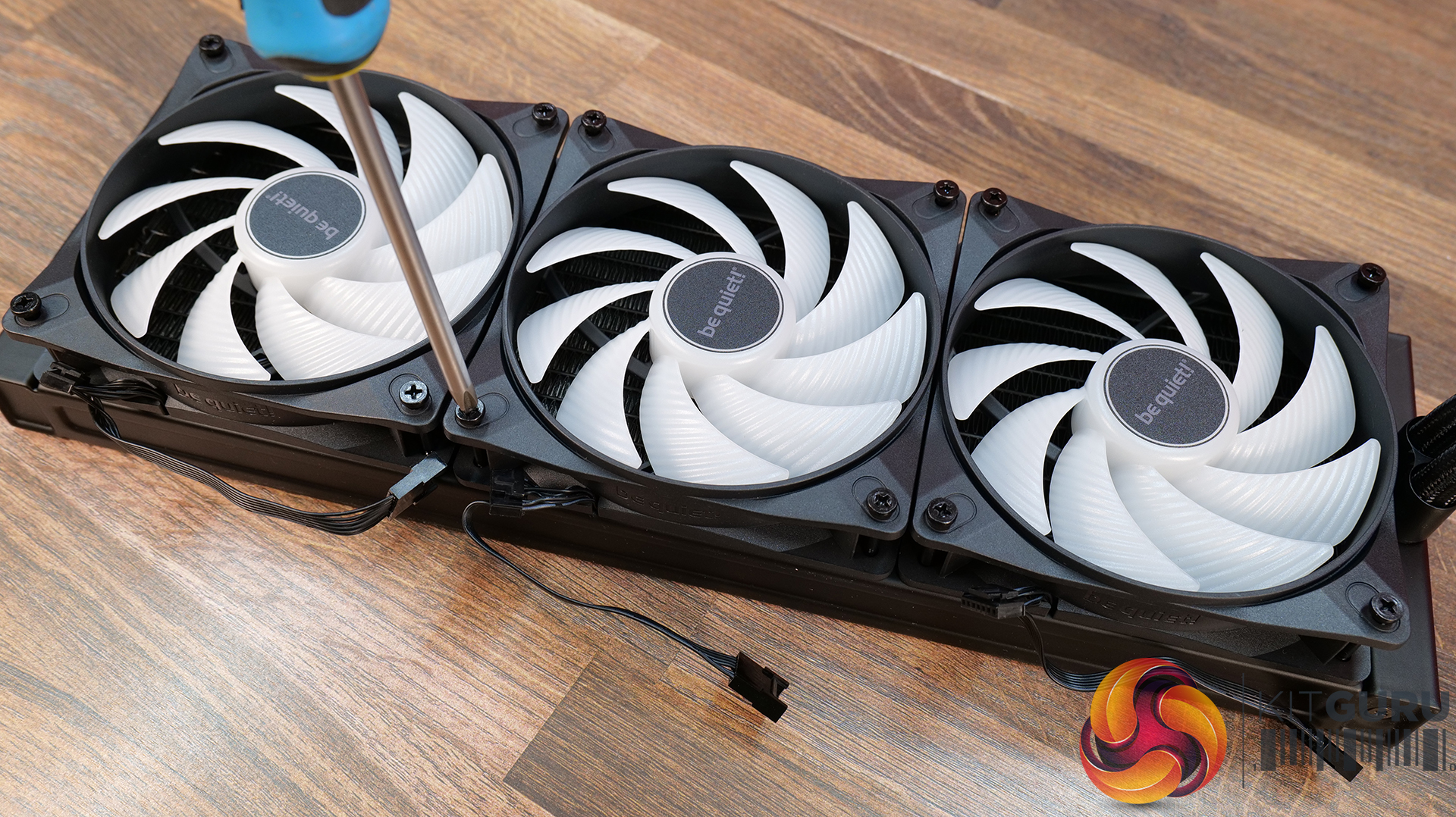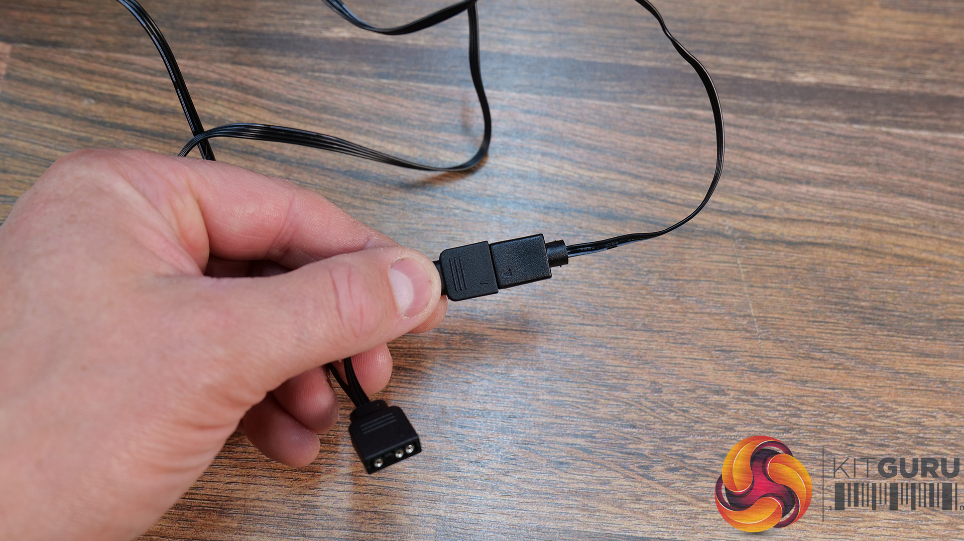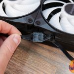 Since the cooler doesn’t come with the fans pre-installed, the first job is to attach the fans to the radiator using the long Phillips head screws found in the accessories pack. Then connect the daisy chain fan wiring and connect the extension to the end of the chain.
