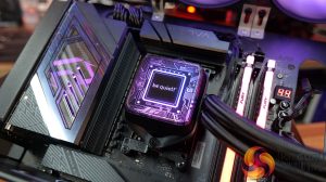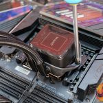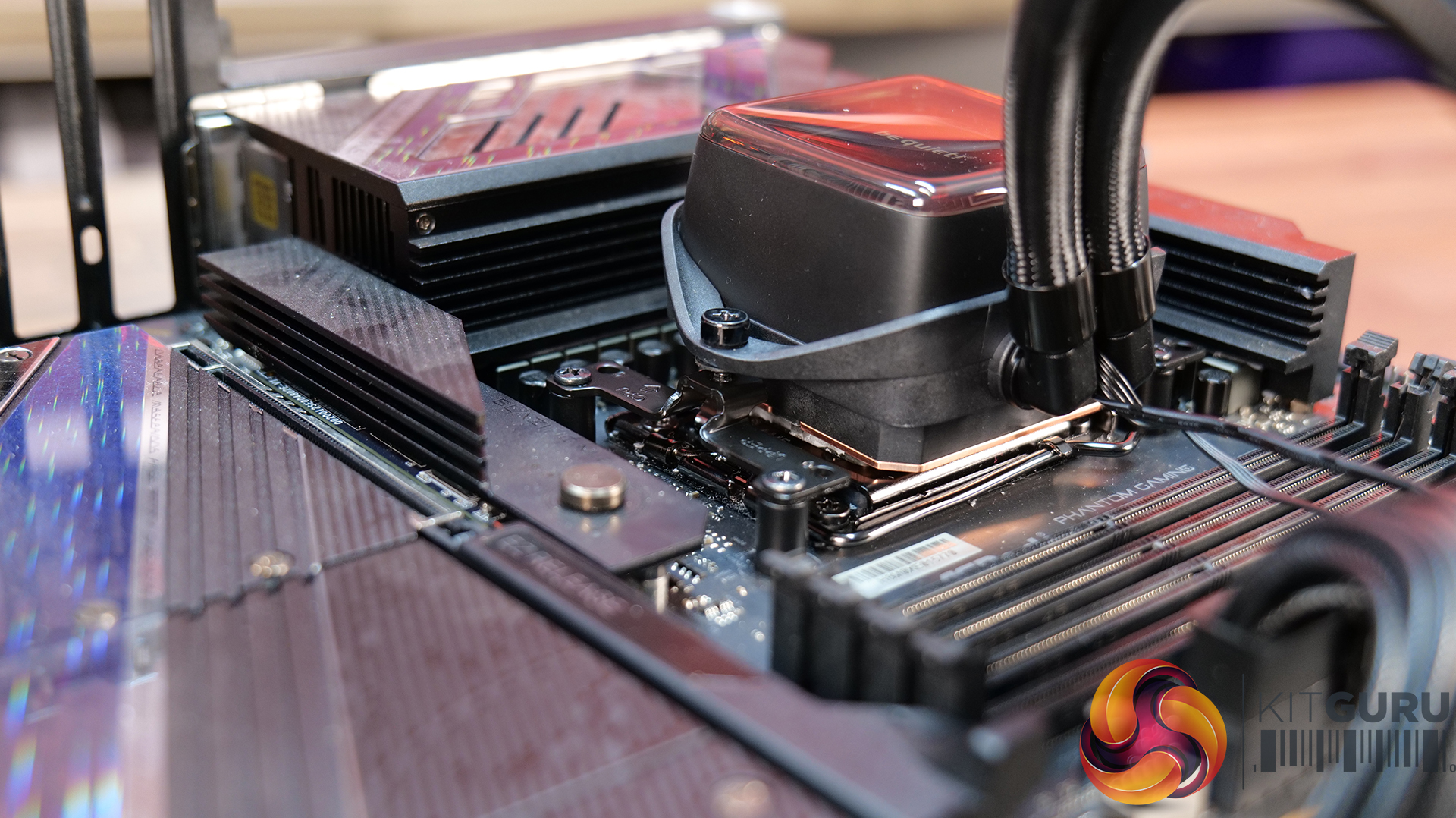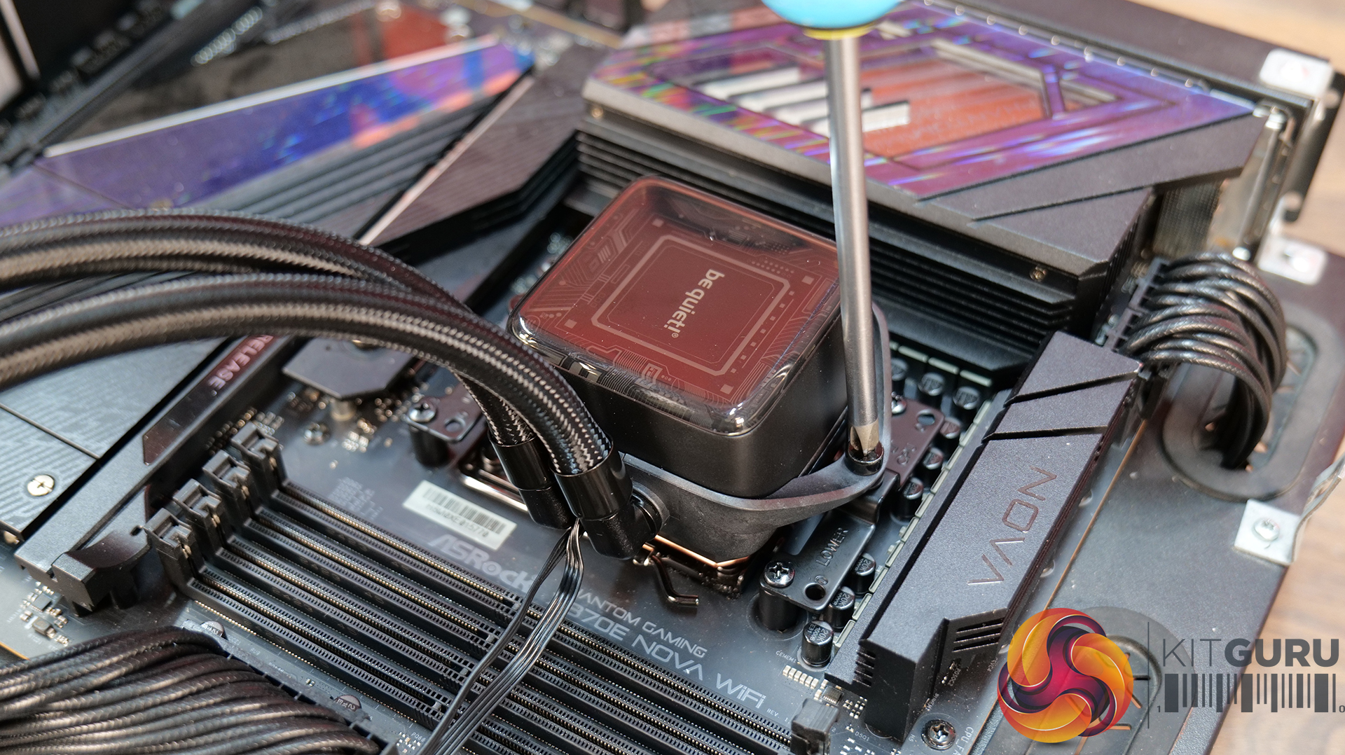 There’s no thermal compound pre-applied to the cold plate base, so now is the time to apply the included thermal compound to the CPU IHS. Then lower the CPU block into position over the CPU and tighten it down using the two mounting screws, tightening evenly and progressively for best contact.