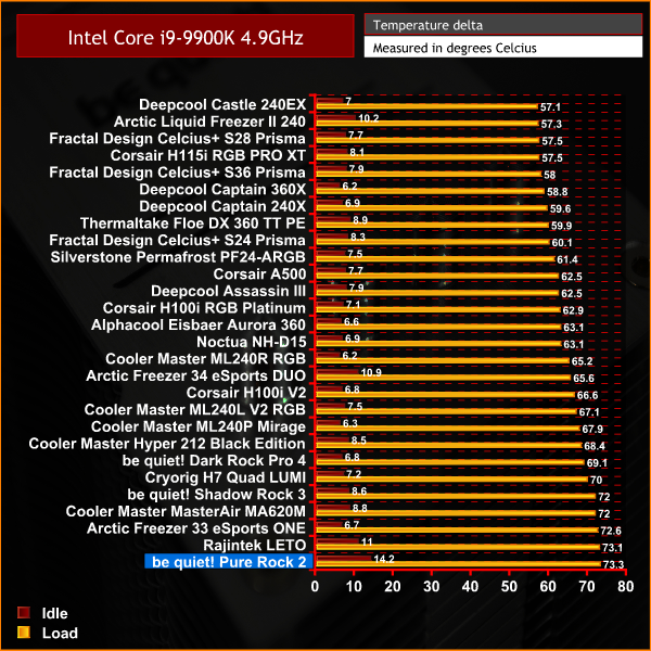 With the Intel Core i9-9900K CPU in our test bench set at its base frequency of 3.6 GHz, we were expecting the thermal performance of the Pure Rock 2 to be around a similar level to other four heat pipe coolers of a similar size, such as the Arctic Freezer 33 and the Cooler Master Hyper 212. However, the Pure Rock 2 was even outperformed by the smaller, two heat pipe Arctic Freezer 7 X which is a little disappointing.