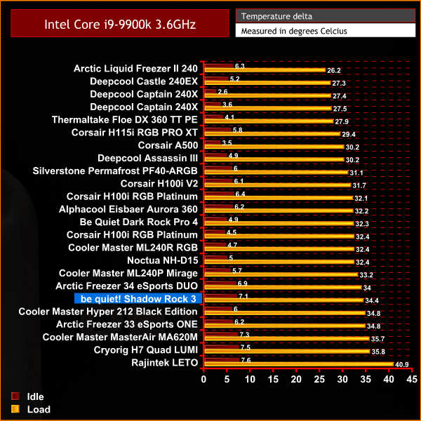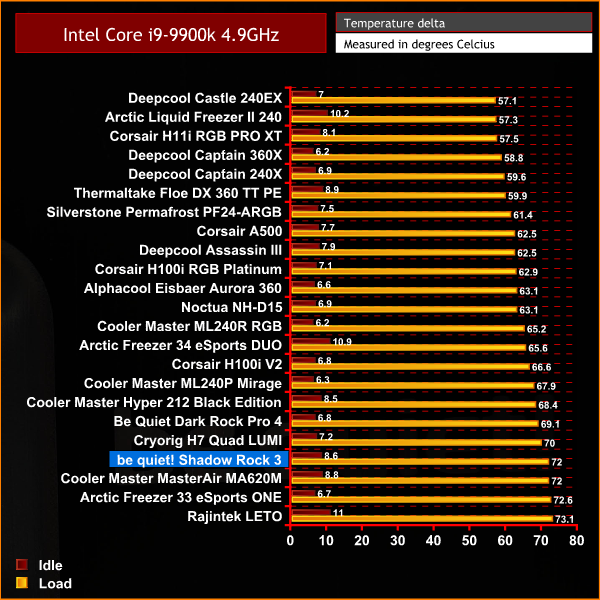 It is a similar story when we crank the Intel Core i9-9900K frequency up to 4.9GHz. Again, the raw thermal performance isn't great, however, it is performing within the range of other CPU tower coolers of a similar design.