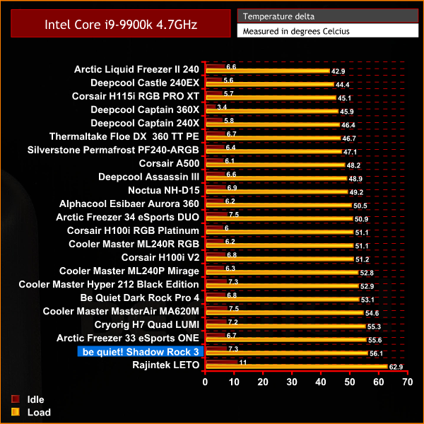 At and all-core CPU frequency of 4.7GHz, the Shadow Rock 3 is again low down in our performance chart. However, its bigger brother, the Dark Rock Pro 4 only performs a few degrees better and is a much larger dual tower cooler.