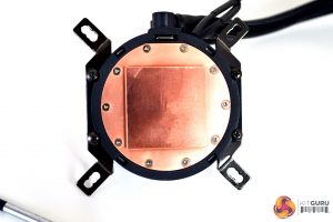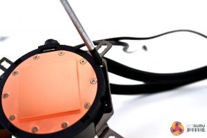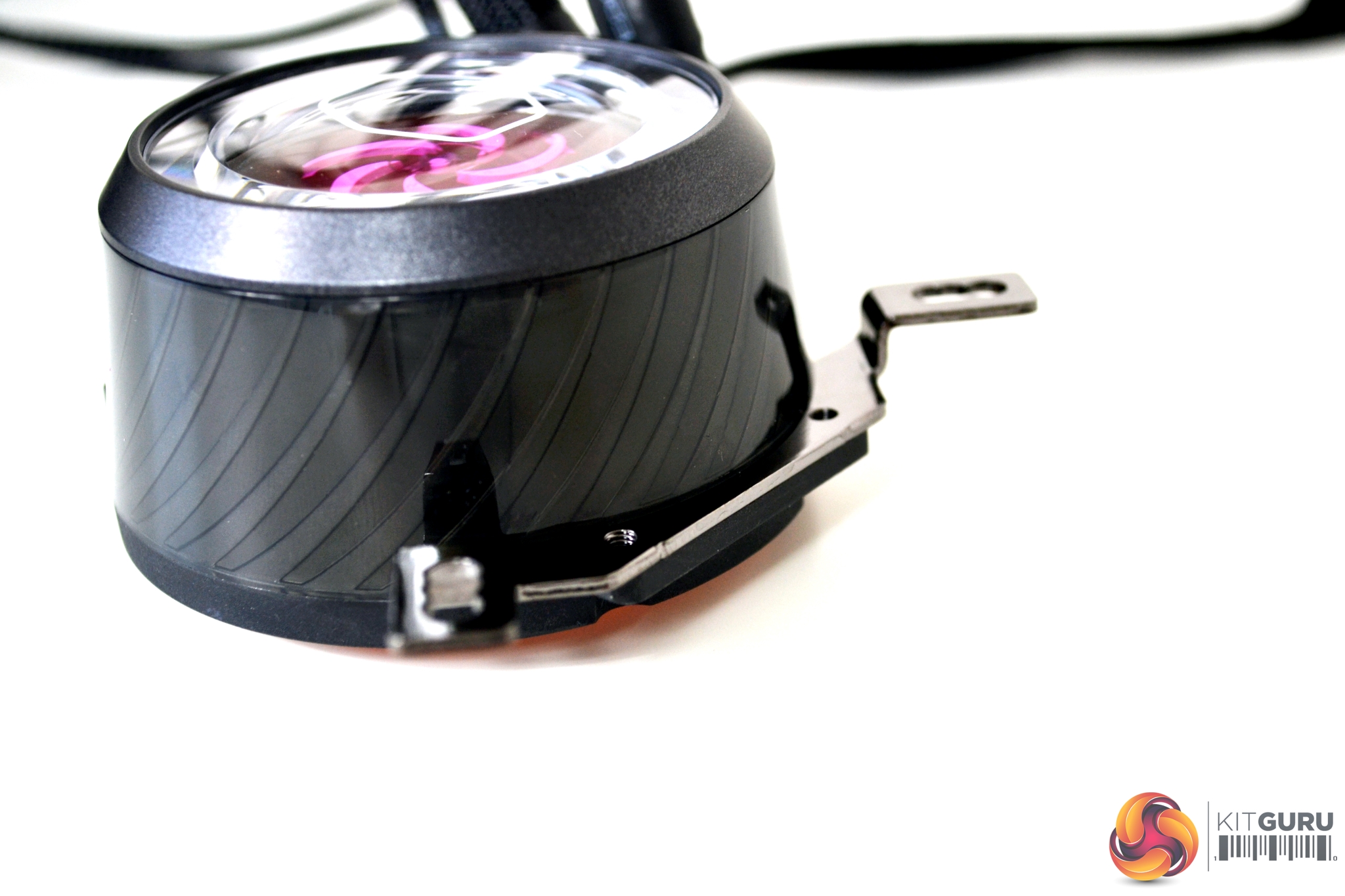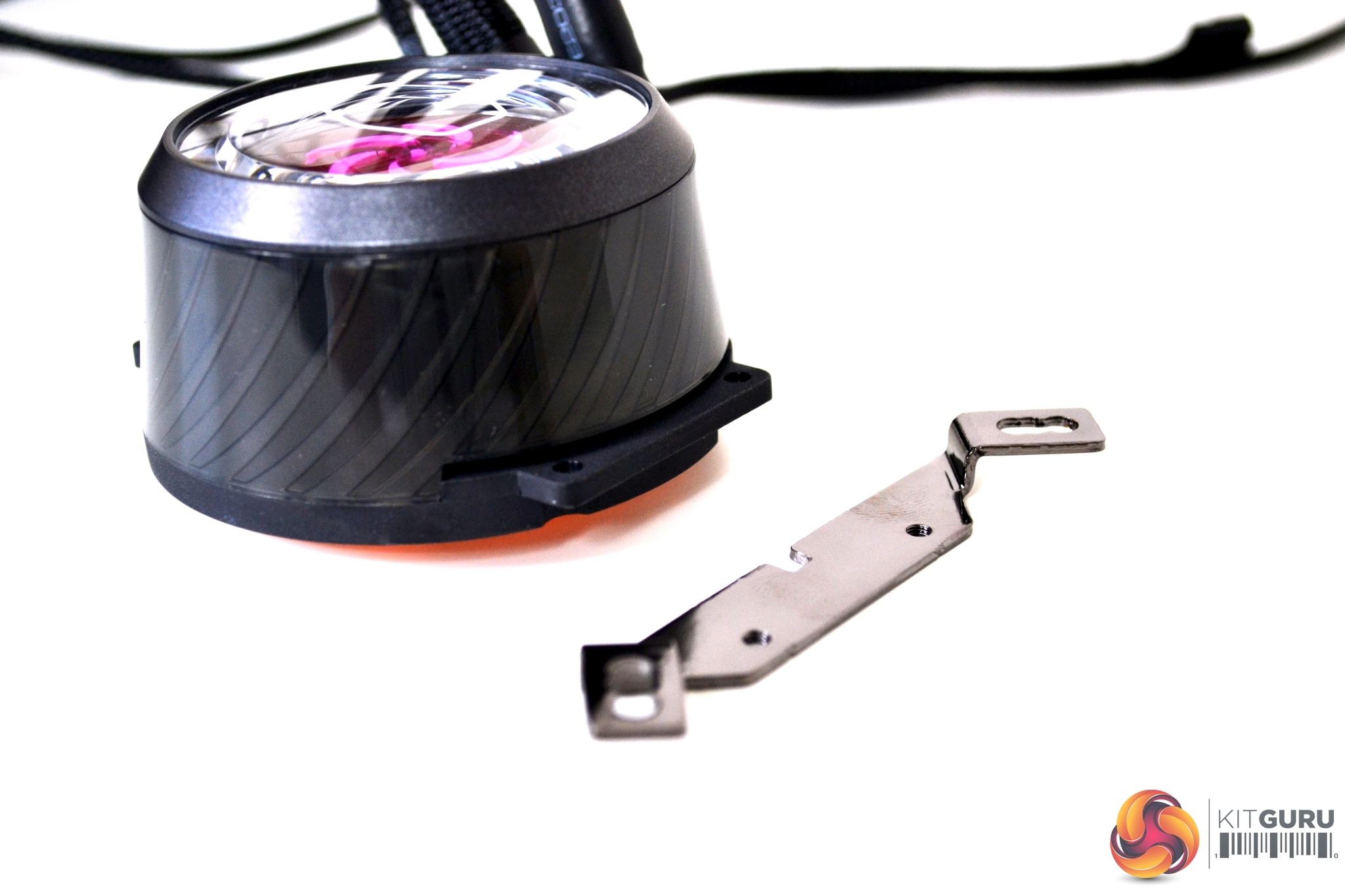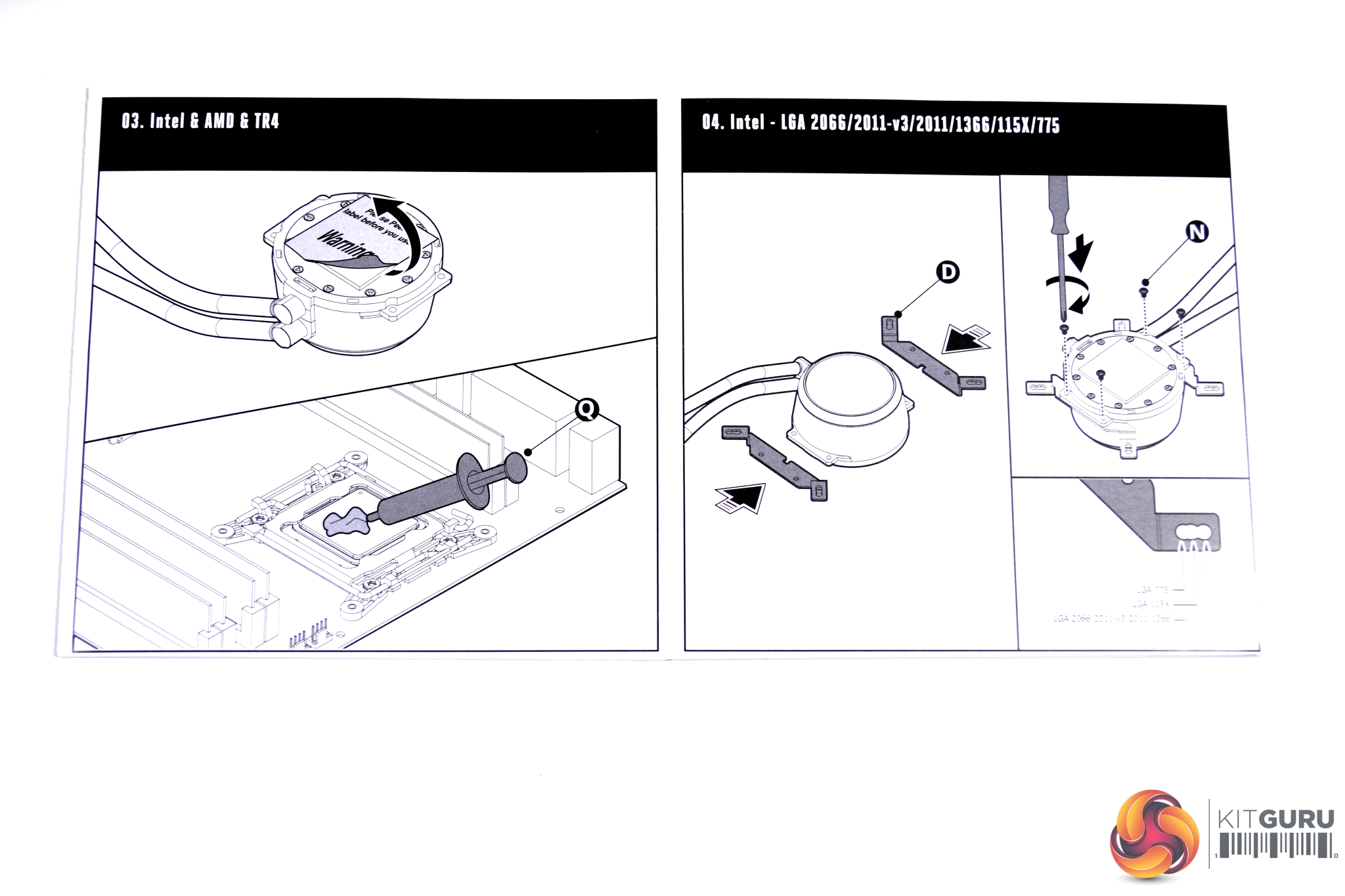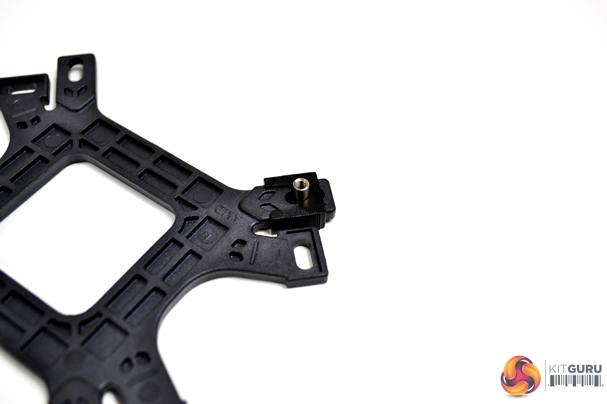 They are then tightened in place by four, fine thread Philips screws from the underside. Make sure the brackets are fitted in the correct orientation, as shown in the installation documentation. If not, the pump will not make contact with the CPU IHS, when offered up to the motherboard.