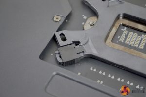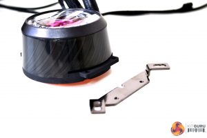 Next, we prepare the pump/block for installation by taking the relevant Intel retention brackets (also a black chrome finish) and inserting them into the notched slots in the side of the housing.