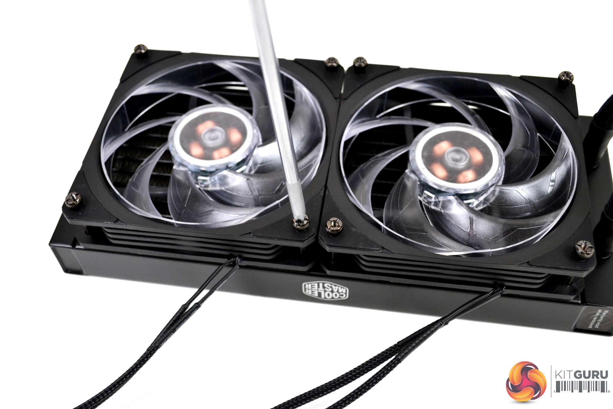 Mounting the radiator in your desired location should be simple, as it uses standard 240mm mounting hole centres. Our test bench is slightly different, so will not be relevant to mounting in an ATX case. Both the 120mm fans connect to a supplied splitter cable. Then, connect to the CPU_FAN header on your motherboard. The RGB lighting cables, attached to the fans, can be connected either directly to the motherboard or via the RGB controller module.