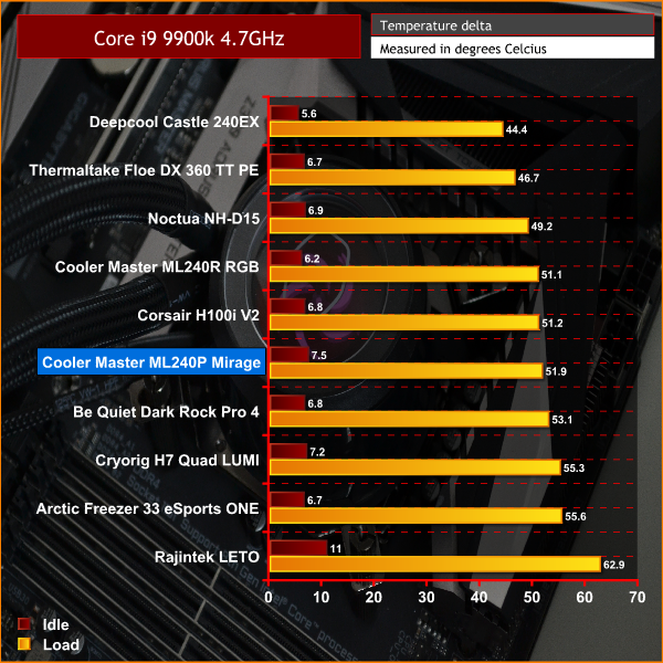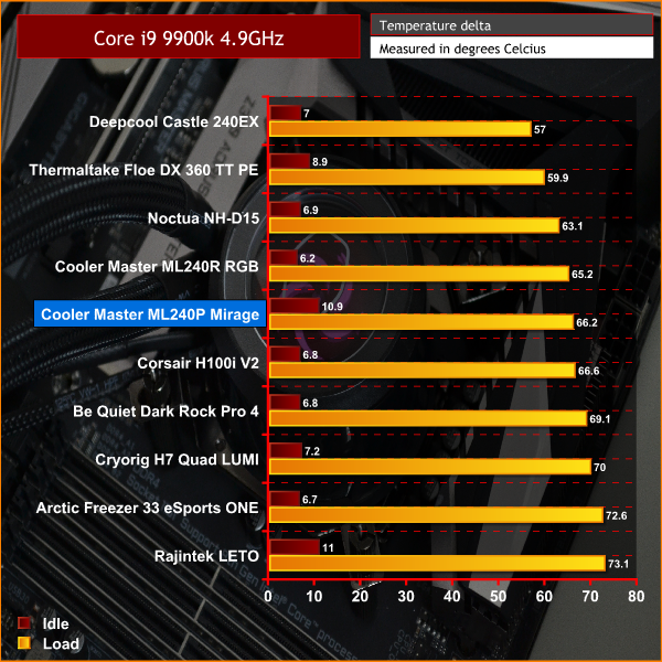With the Core i9 9900k at stock frequency, our Cooler Master ML240P is sitting around mid table with just slightly higher idle and load temperatures than the mighty Noctua NH-D15. However, it is just below its cheaper brother the ML240R RGB which seems odd. Still outperforming the lower priced air coolers though.