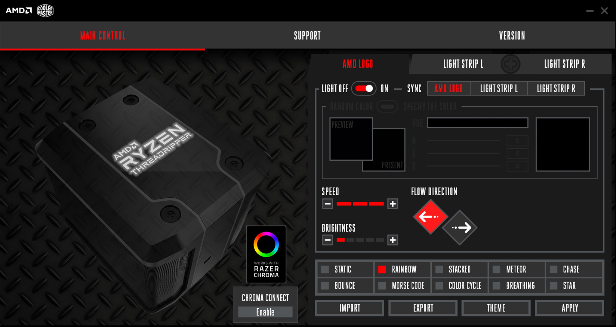 Once installed, there are multiple options. The software splits the coolers RGB lighting up into three areas – the AMD Threadripper logo, light strip L and light strip R. All three areas can be configured individually or in sync.