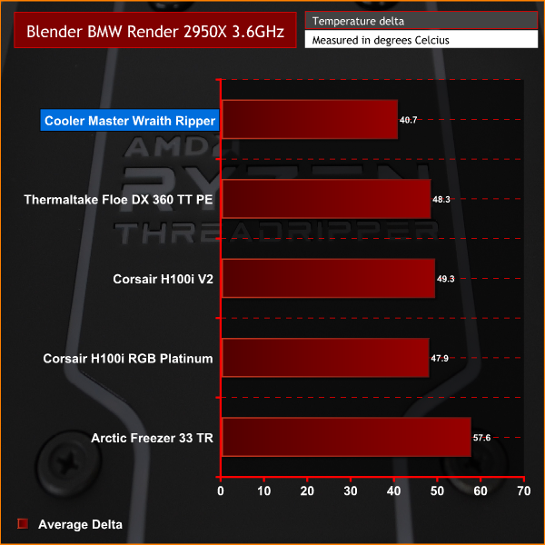 Again, in our productivity test, the Wraith Ripper is doing a great job of keeping temperatures under control. The advantage of the full cover heat transfer plate proves a worthy improvement over the other adapted AIO coolers.