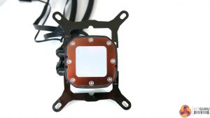 Next, lower the pump down over the CPU and align with the mounting posts. Take the four thumbscrews and tighten in an X pattern to evenly spread pressure on the CPU HIS. Final tightening can be finished off with a screwdriver if necessary.