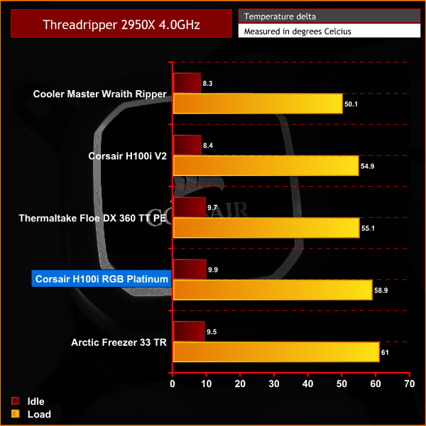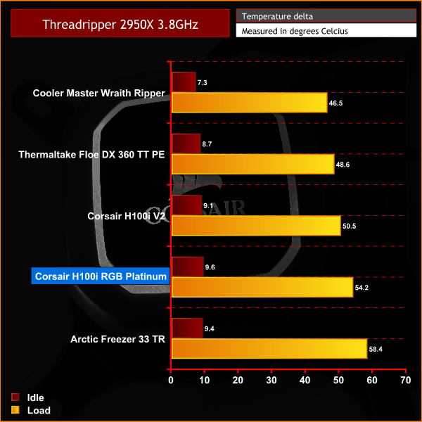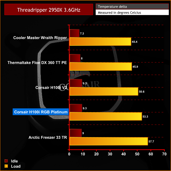 As we can see from the charts above the Corsair H100i RGB Platinum does not achieve the results we saw in our previous i7-7700k review. The considerably higher TDP of the 2950X proves to be a much more demanding task than the quad-core 7700K.