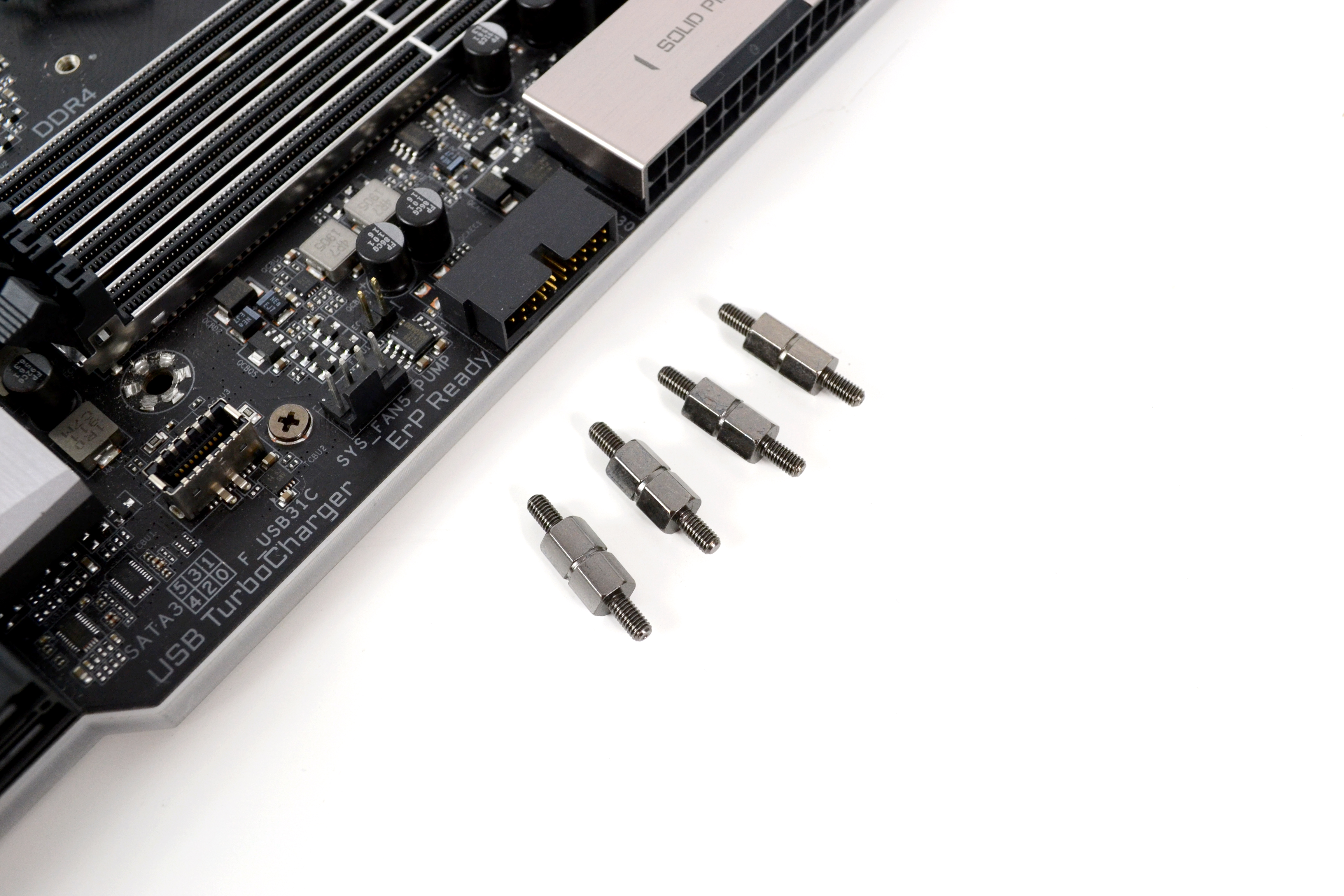 Now select the relevant Intel LGA 115x/1200 standoffs and working from the top side of the motherboard, screw the standoffs to the backplate. Tightening the standoffs by hand will provide the required amount of torque, no tools are needed for this part of the installation.