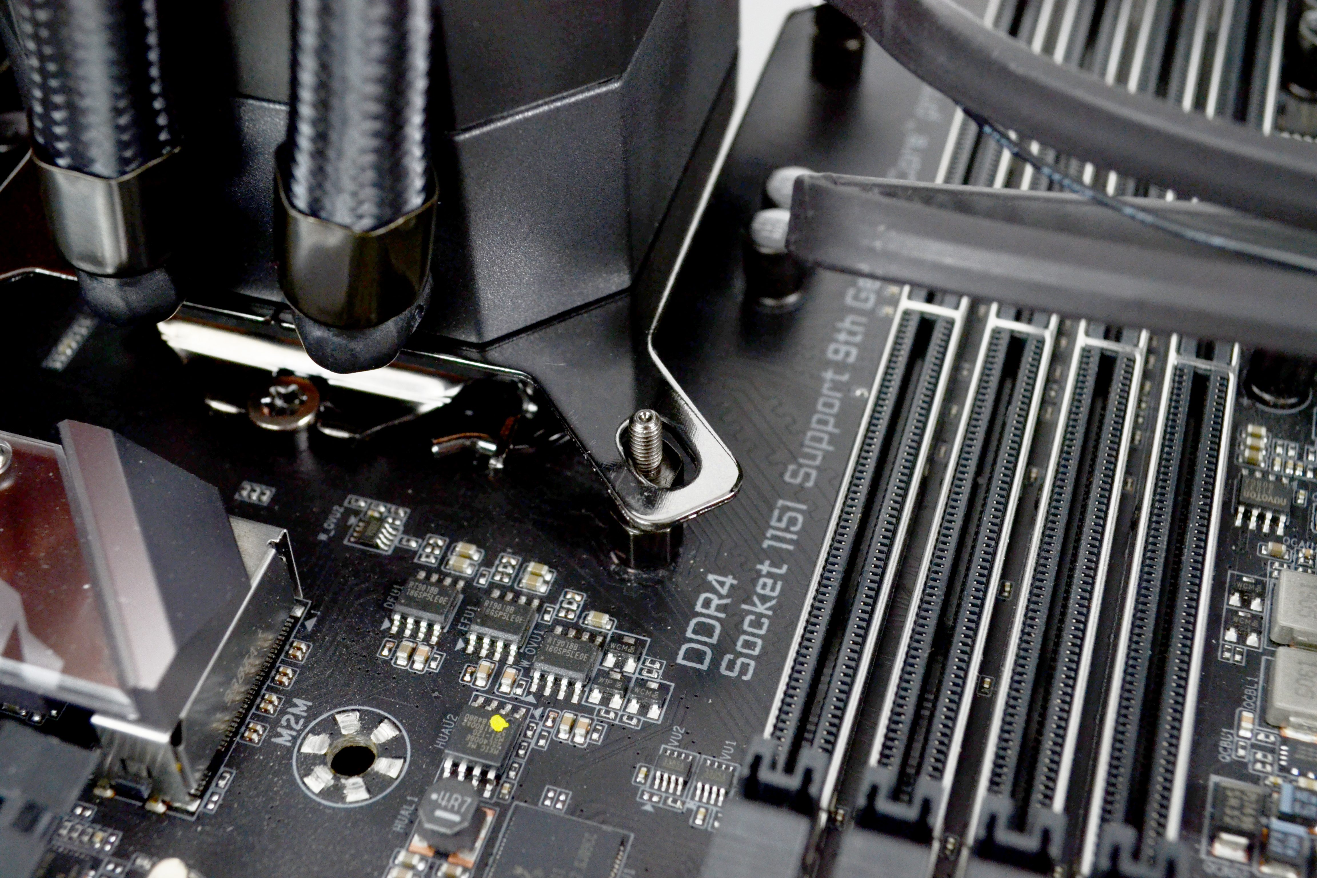 Since the coolers base plate comes with a pre-applied thermal compound coating, there is no need to apply additional thermal compound to the CPU heat spreader. Simply lower the CPU block down on to the CPU, aligned with the standoffs and using the four thumbscrews, tighten the CPU block progressively using an X shape pattern to evenly spread pressure over the CPU for optimal contact.
